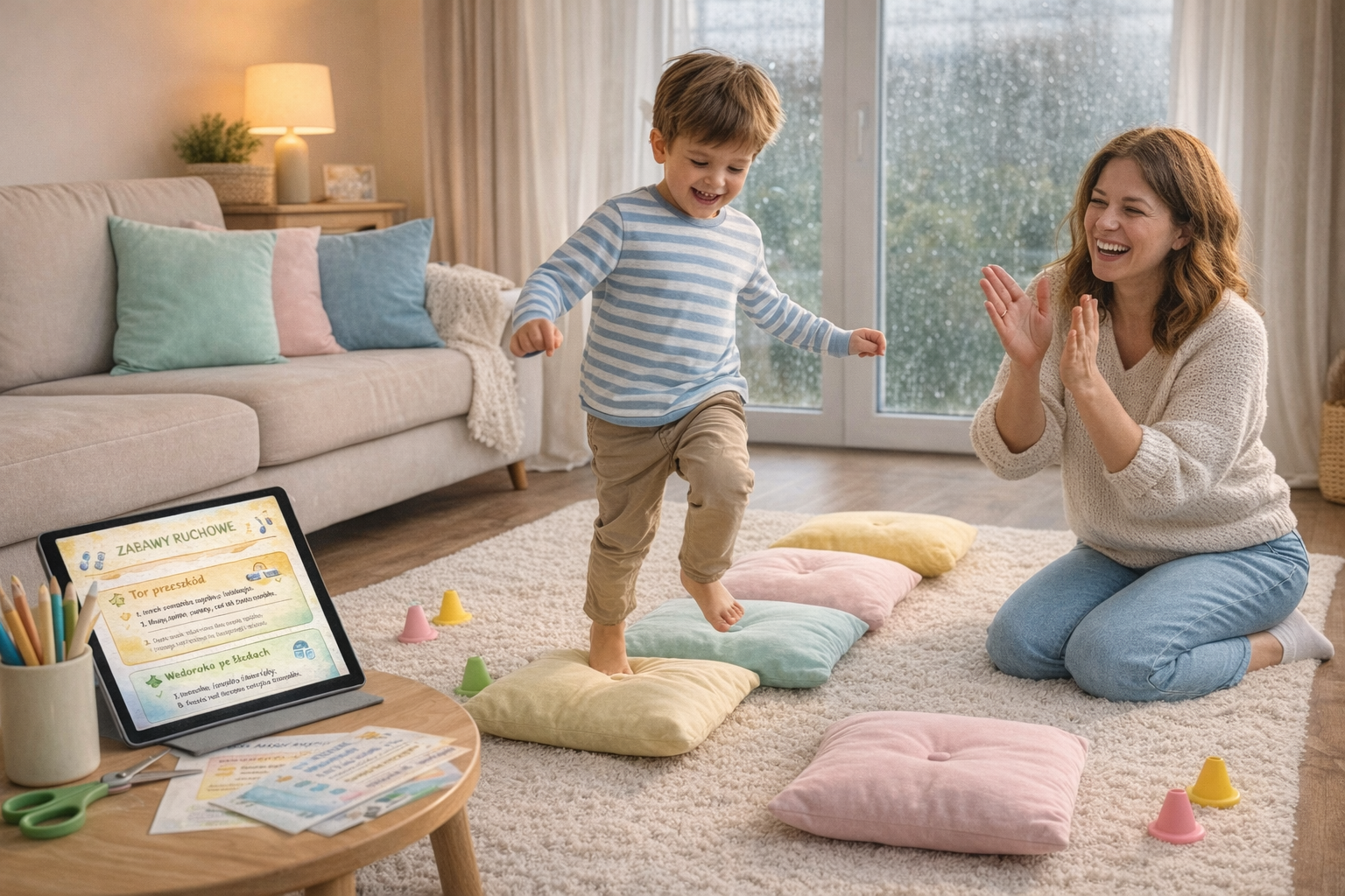 1️⃣ RUCH I TANIEC W DOMU – skoki, rytmy, balony, tory przeszkód, olimpiada w salonie! 💃🕺