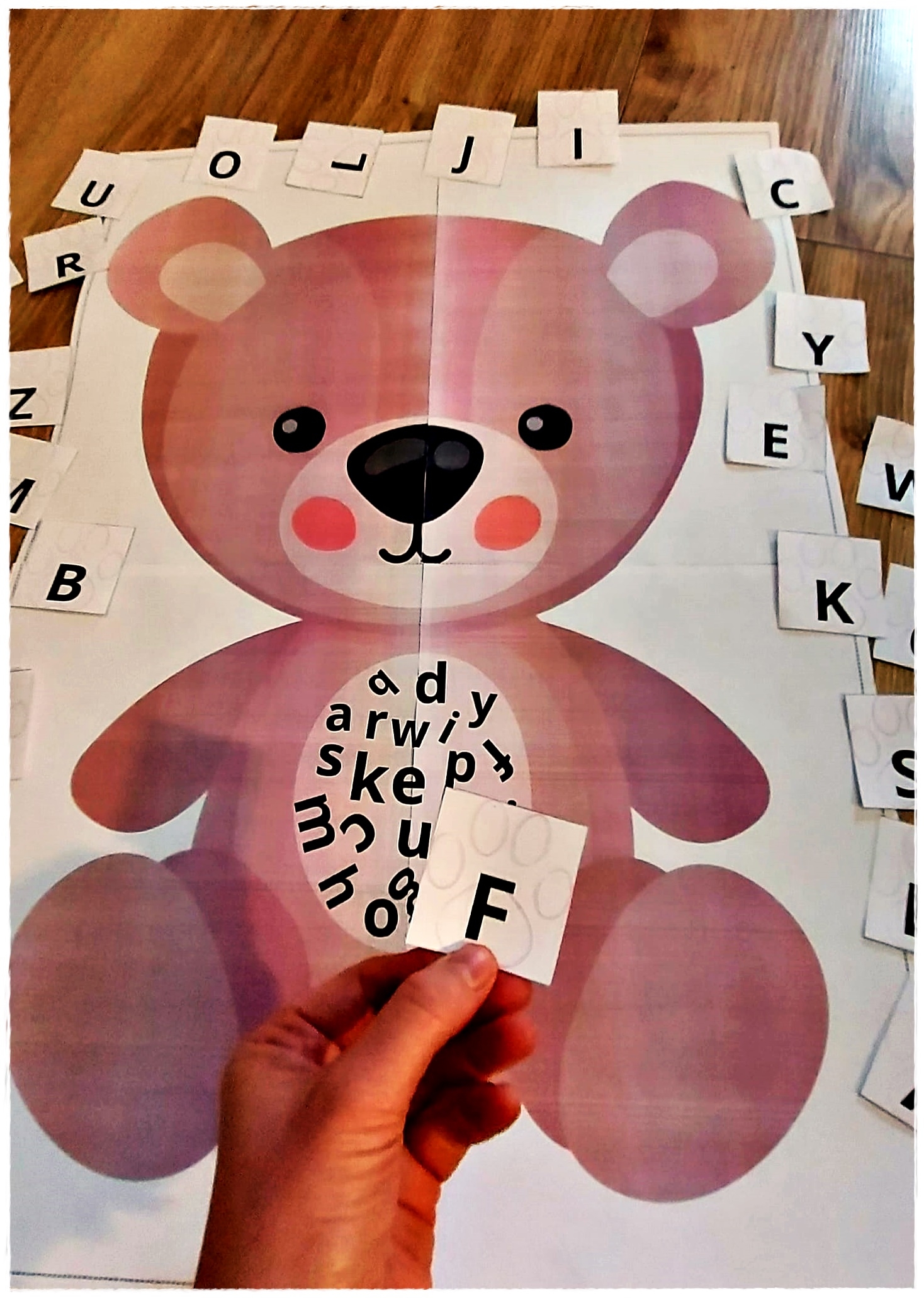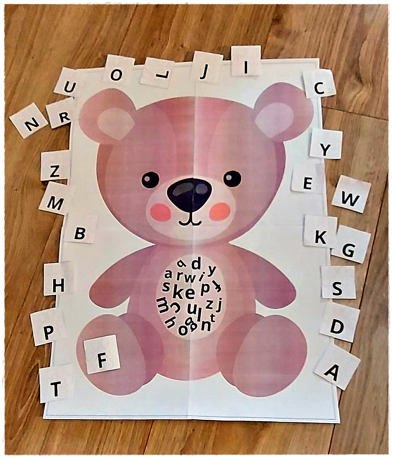Wariant 1: Dzieci losują kartę z wielką literą i szukają odpowiadającej jej małej litery na brzuszku misia.