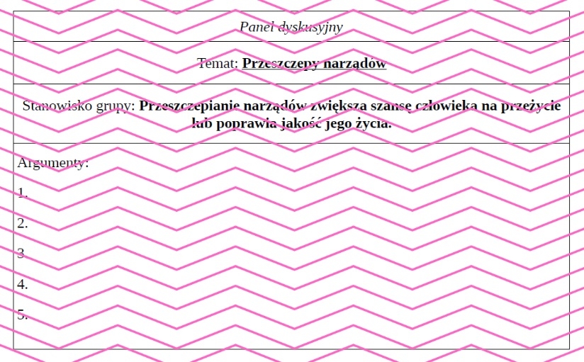 Karta pracy dla grup uczniów uczestniczących w panelu dyskusyjnym dotyczącym zaburzeń układu odpornościowego. Zawiera 3 tematy: przeszczepy narządów, reakcje alergiczne i AIDS z dwoma przeciwnymi stanowiskami (łącznie 6 grup). Na karcie znajduje się miejsce do podania kilku argumentów przez uczniów przemawiających za ich stanowiskiem, po wcześniejszym zapoznaniu się z tematem w podręczniku, np. "Biologią bez tajemnic" WSiP.