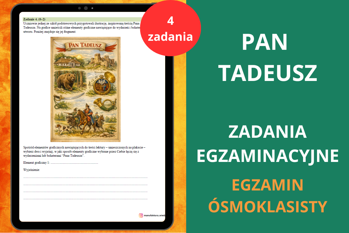 Zestaw zadań egzaminacyjnych do lektury Pan Tadeusz Adama Mickiewicza to materiał przygotowany z myślą o uczniach, którzy chcą skutecznie przygotować się do egzaminu ósmoklasisty.