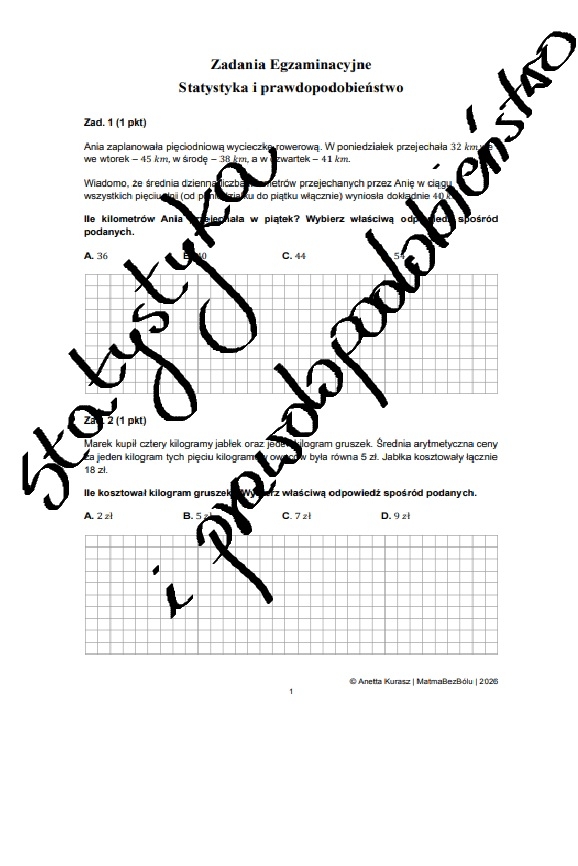Zadania zamknięte (1-4): Obliczanie średniej arytmetycznej w sytuacjach praktycznych, analiza prawdopodobieństwa przy losowaniu przedmiotów oraz właściwości liczb dwucyfrowych.
