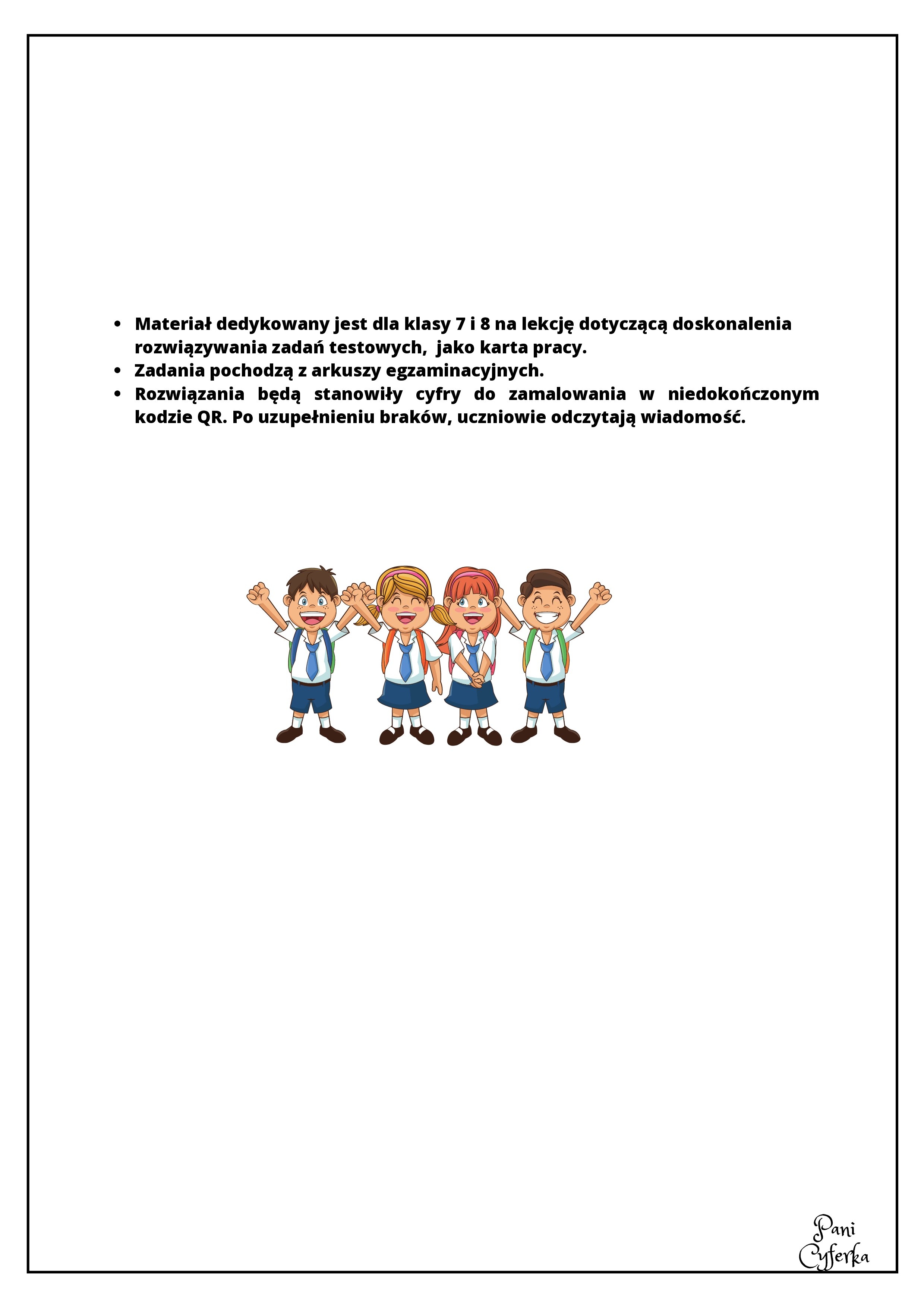 Materiał dedykowany jest dla klasy 7 i 8 na lekcję dotyczącą doskonalenia rozwiązywania zadań testowych, jako karta pracy. Zadania pochodzą z arkuszy egzaminacyjnych. Rozwiązania będą stanowiły cyfry do zamalowania w niedokończonym kodzie QR. Po uzupełnieniu braków, uczniowie odczytają wiadomość.