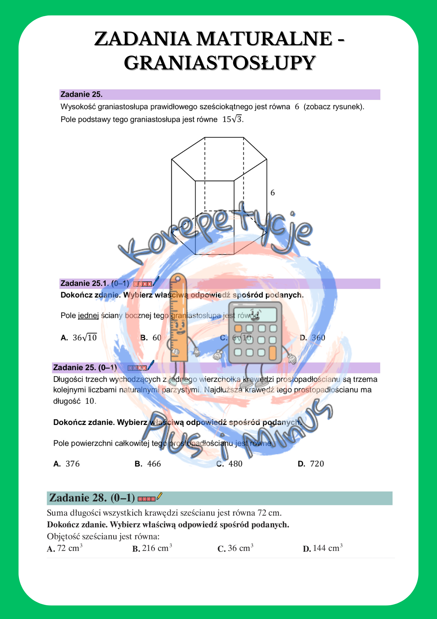 Przygotuj się solidnie do matury z matematyki! Ten zestaw zadań to doskonałe narzędzie dla uczniów szkół średnich, którzy chcą opanować temat graniastosłupów na poziomie maturalnym. Znajdziesz tu starannie dobrane przykłady z poprzednich lat, które pomogą Ci przećwiczyć wszystkie typowe zagadnienia i utrwalić kluczowe wzory.