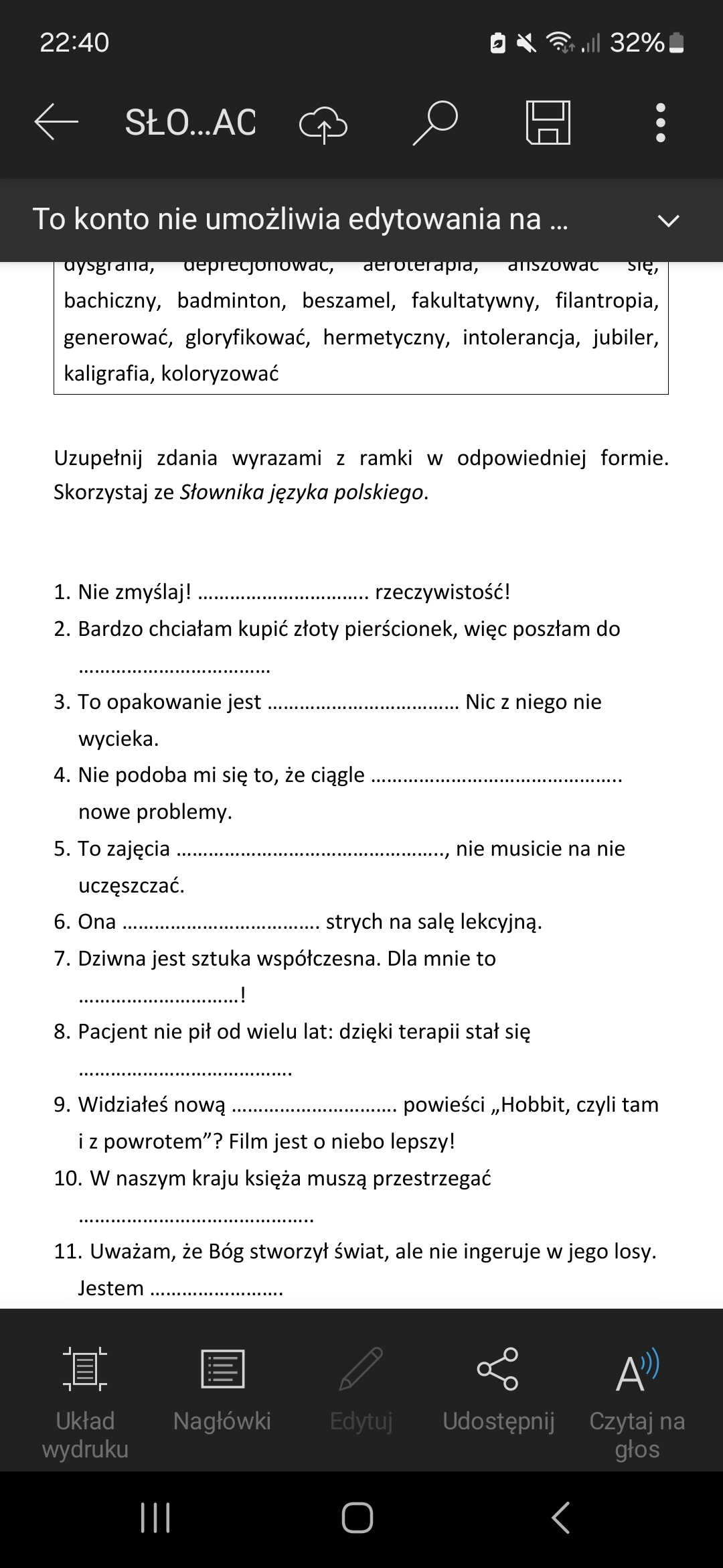 Karta pracy dla uczniów klas 6-8 SP, do wykorzystania w pracy ze Słownikiem języka polskiego lub ze Słownikiem wyrazów obcych. Karta zawiera 27 zdań do uzupełnienia trudnymi wyrazami wraz z odpowiedziami.