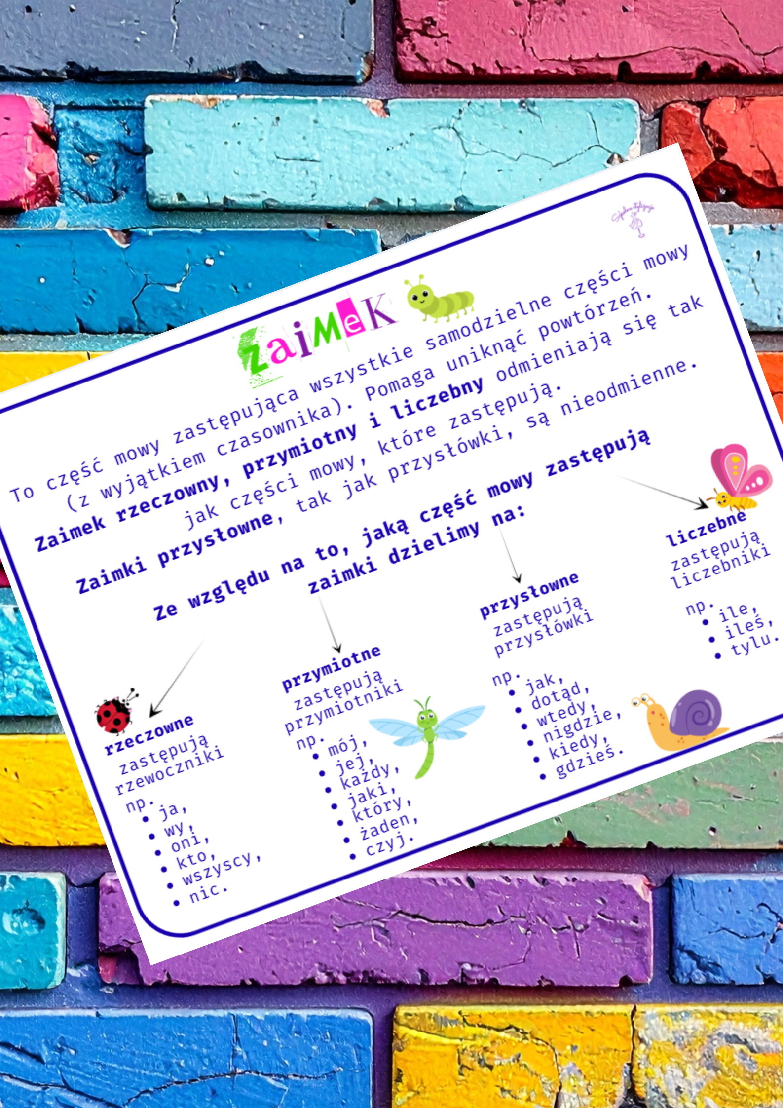 Ta wklejka to Twoja szybka ściąga i sprytny pomocnik w ogarnięciu jednego z najbardziej „zastępczych” tematów w języku polskim. Dzięki niej dowiesz się, czym właściwie jest zaimek (czyli mistrz podszywania się pod inne słowa), jakie są jego rodzaje i kiedy warto go używać, żeby zdanie brzmiało lepiej i… krócej!