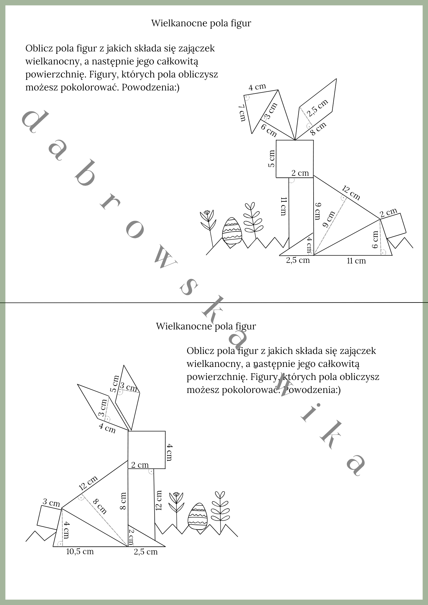 Uczniowie mają za zadanie obliczyć pola figur z jakich składają się zajączki wielkanocne, a następnie ich całkowitą powierzchnię. Dodatkowo figury, których pola obliczy – może pokolorować.