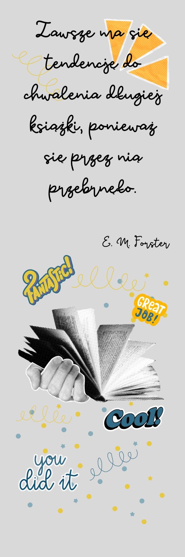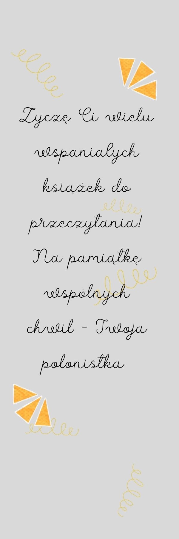 Zakładki do książek są odpowiedzią na Państwa zapytania o drobny upominek, który można podarować uczniom z okazji zakończenia roku szkolnego. Ta dwustronna zakładka utrzymane jest w klimacie retro. Z jednej strony znajduje się kolaż oraz cytat E. M. Forstera, a z drugiej życzenia: Życzę Ci wielu wspaniałych książek do przeczytania! Na pamiątkę wspólnych chwil - Twoja polonistka. Zostawiam trochę miejsca, aby zmieścił się jeszcze Państwa własnoręczny podpis, choć nie jest to, oczywiście, konieczne. Zapraszam także do obejrzenia innych zakładek:)