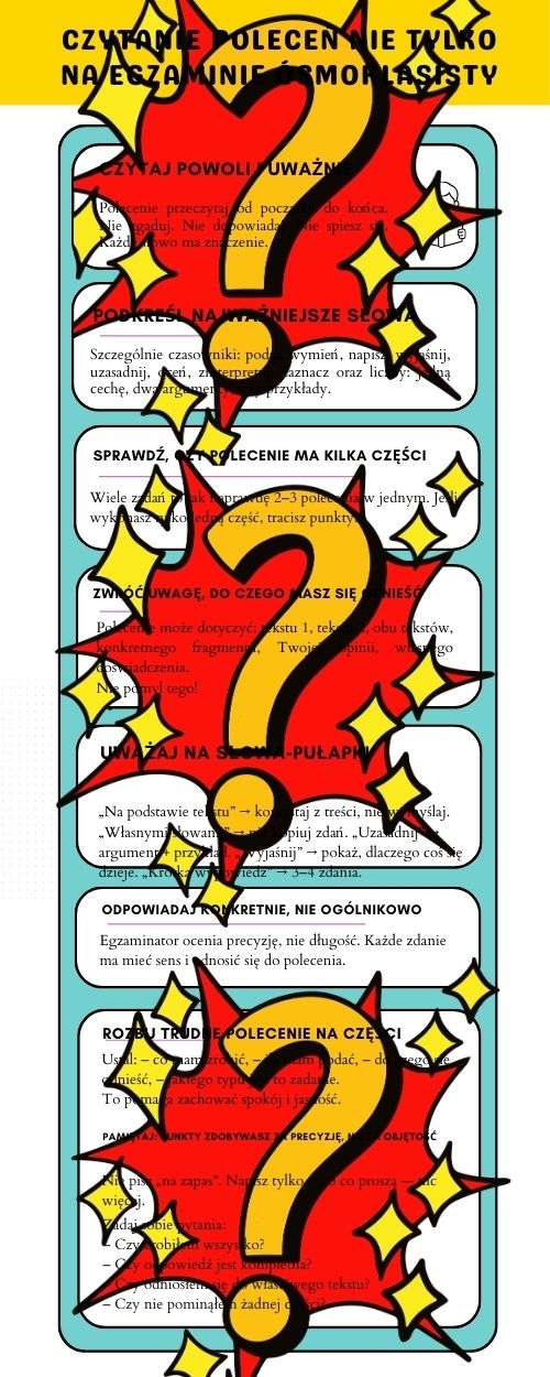 ✅ Uczy, jak podkreślać najważniejsze słowa ✅ Przypomina, że „uzasadnij” to nie to samo co „wyjaśnij” ✅ Pokazuje, jak rozbić trudne polecenie na proste kroki ✅ Przypomina, że egzaminator nie ocenia długości, tylko trafność