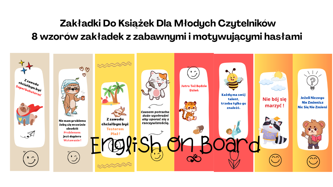 8 wzorów zakładek z zabawnymi i motywującymi hasłami.