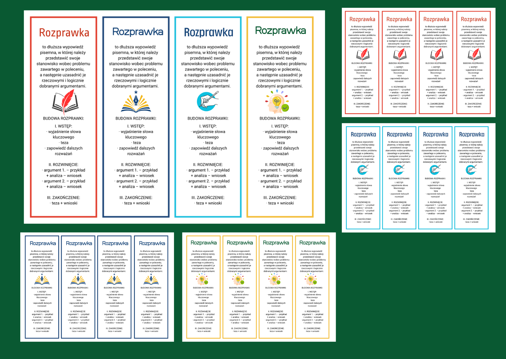 Praktyczny zestaw 4 rodzajów zakładek do książek z definicją rozprawki oraz zasadami jej pisania. Na każdej zakładce znajdują się także poprawne formy wyrazów często używanych w rozprawce, co ułatwia uczniom tworzenie poprawnych i spójnych wypowiedzi pisemnych. Materiał składa się z 5 stron: - 1 strona – komplet 4 zakładek, - 4 kolejne strony – przeznaczone dla poszczególnych wersji zakładek. Zakładki świetnie sprawdzą się jako pomoc dydaktyczna na lekcjach języka polskiego oraz do samodzielnej pracy uczniów. Po wydrukowaniu i wycięciu warto je zalaminować lub wydrukować na grubszym papierze, aby służyły przez dłuższy czas.