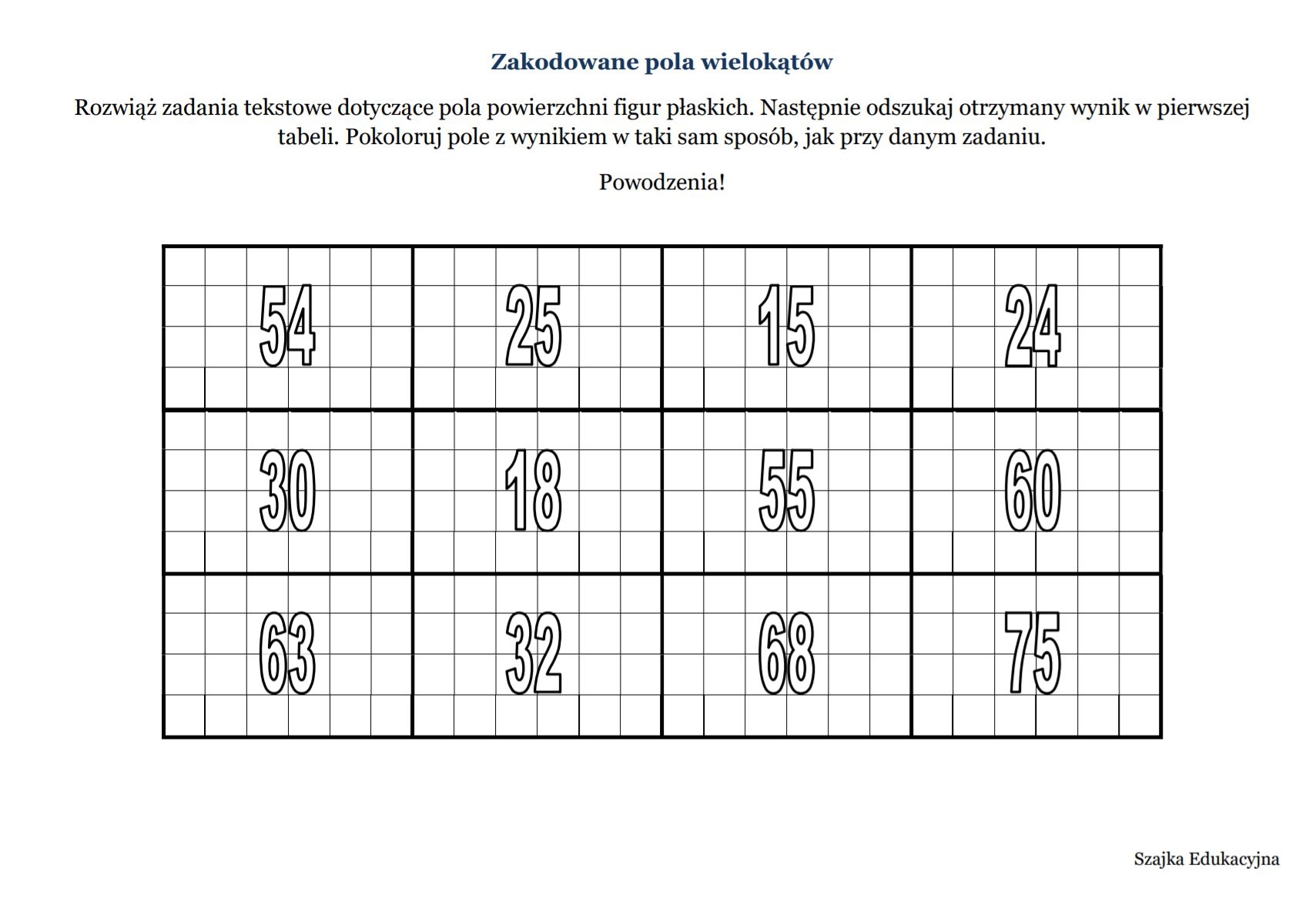 Zadaniem uczniów jest prawidłowe wykonanie wszystkich zadań. Otrzymany wynik należy odnaleźć w przygotowanej przeze mnie kratownicy, a następnie pomalować to pole według schematu znajdującego się przy działaniu. Poprawne wykonanie całego zadania odkryje tajemniczy rysunek ? Życzę dobrej zabawy ? P.S. Po zamalowaniu wszystkich pól powinien pojawić się wzór na pole kwadratu.