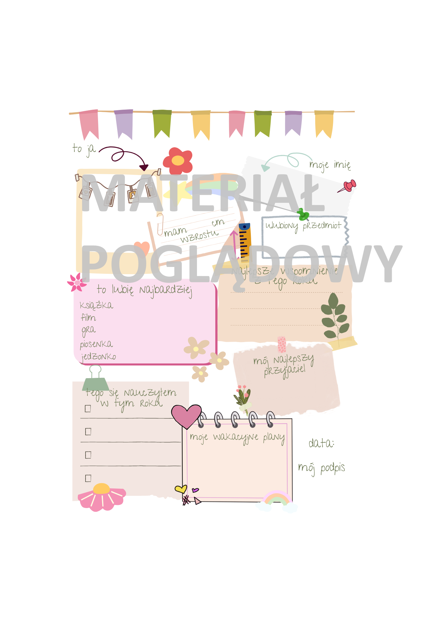 Materiał do wykorzystania na ostatnich zajęciach z wychowawcą. Uczniowie tworzą swoje wspomnienia z roku szkolnego. Można zamknąć wszystkie karty we wspólnym pudełku i otworzyć na koniec szkoły.