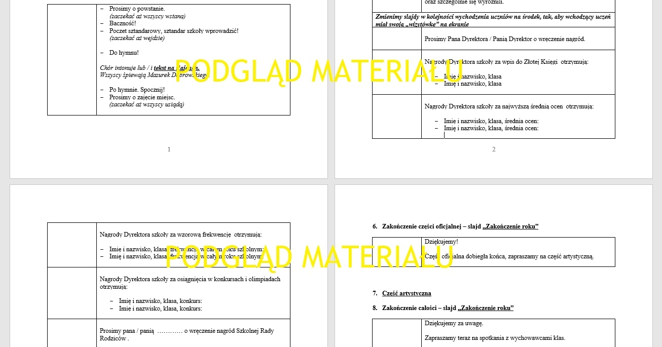 Ostatni dzwonek tuż tuż, a Ty nie wiesz w co ręce włożyć? Może pomoże Ci mój uniwersalny, edytowalny scenariusz części oficjalnej zakończenia roku szkolnego? Wszystko po kolei: powitanie, sztandar, hymn, przemówienia, wyróżnienia. Rozpisane przejrzyście, z miejscami na zaznaczenie kto co mówi. Plik jest edytowalny (Word), można zmienić tekst, wielkość liter czy cokolwiek, aby łatwo dostosować schemat do potrzeb konkretnej szkoły. Do tego prezentacja ze slajdami ogólnymi (napis, godło, tekst hymnu) oraz wizytówkami wyróżnianych osób. Wizytówki przydają się szczególnie wtedy, gdy nie wszyscy w szkole się znają :) Wyróżniony uczeń wychodzi na środek po odbiór gratulacji i nagród, a w tym czasie na ekranie widnieje jego imię, nazwisko i informacja o osiągnięciach - u mnie bardzo się to sprawdza! Prezentację można edytować: dodać, ująć slajdy, zmienić kolor lub typ projektu - jest w Power Poincie. Zapraszam!