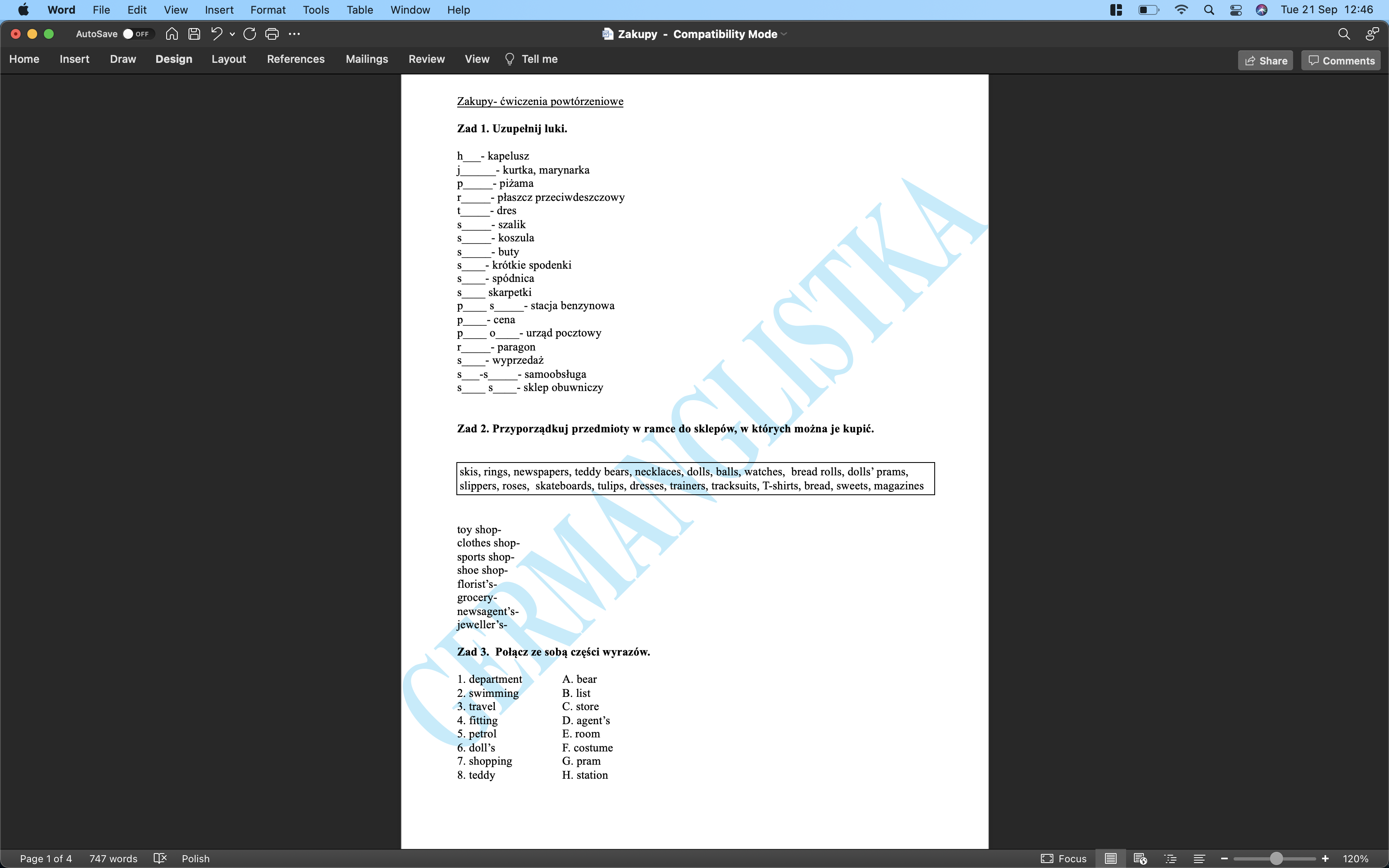 10 ćwiczeń z tematu ZAKUPY z kluczem,