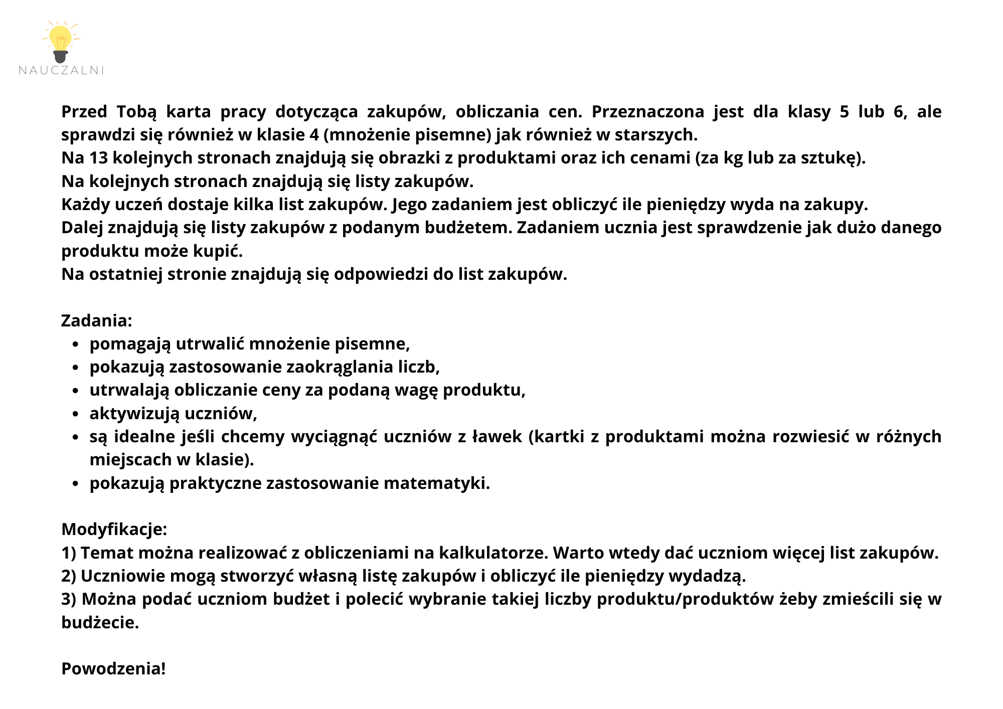 1) Temat można realizować z obliczeniami na kalkulatorze. Warto wtedy dać uczniom więcej list zakupów.