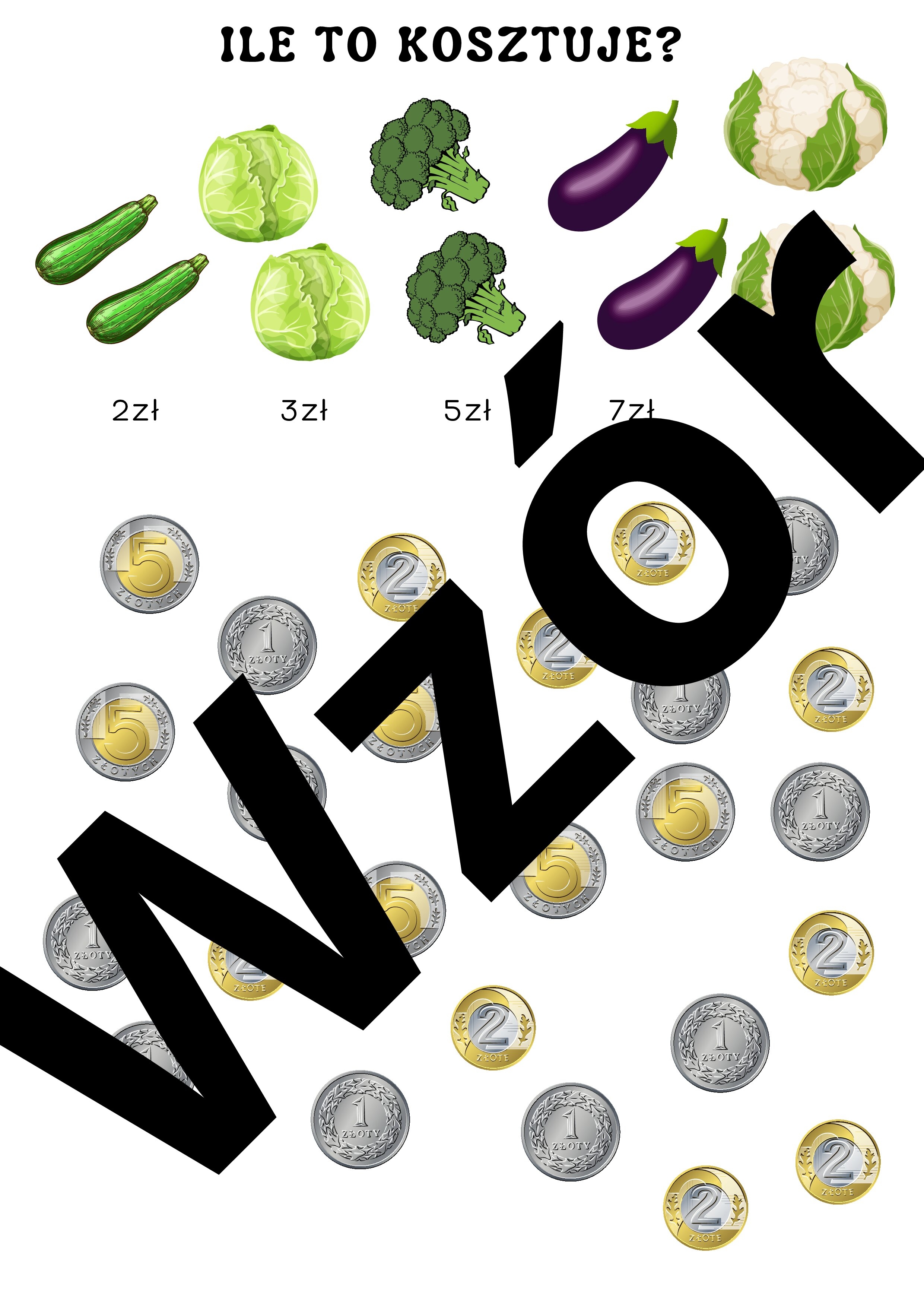 Obliczenia pieniężne dla klasy I. Zestaw zawiera dwie strony na jednej koszyki zakupowe a na drugiej warzywa wraz z pieniędzmi (bilon 1-5 zł). Pracę z dziećmi można wykonywać na wiele sposobów POLECAM!