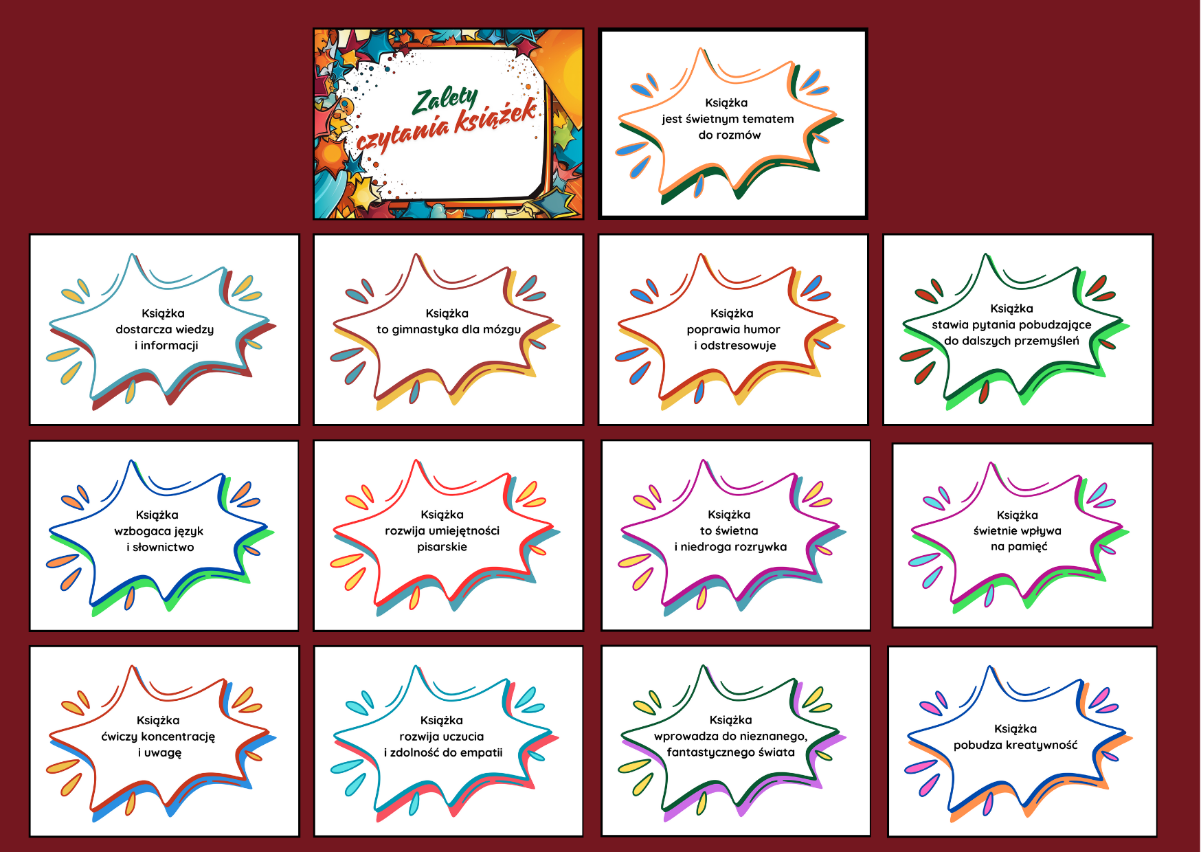 Gazetka pt. „Zalety czytania książek” – składa się z 14 stron A4 pdf do wydruku.