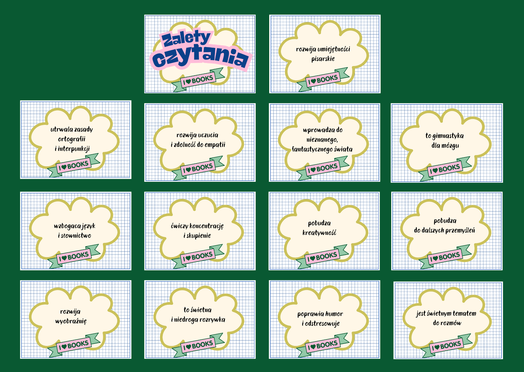 Gazetka pt. „Zalety czytania” – składa się z 14 stron A4 pdf do wydruku.