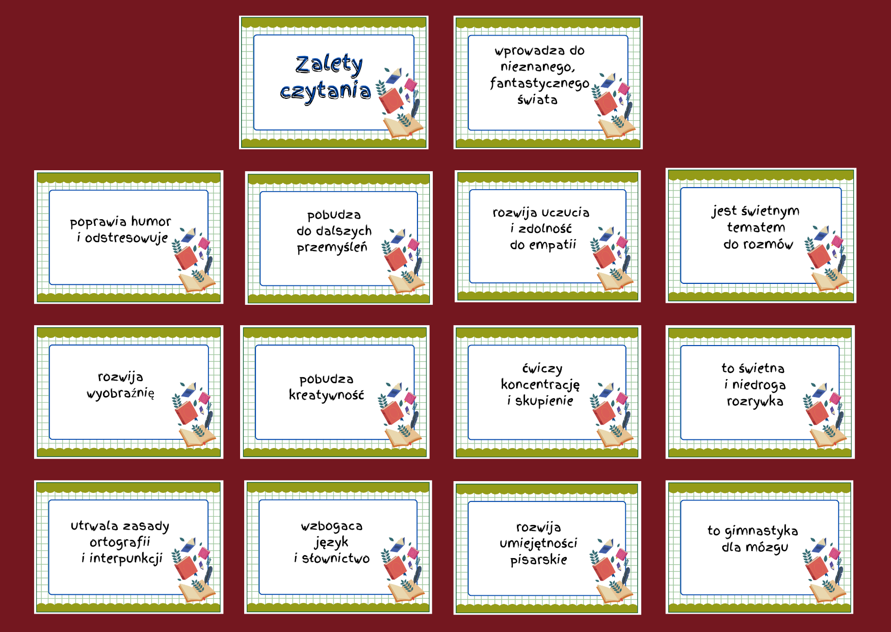 ZALETY CZYTANIA KSIĄŻEK – gazetka – biblioteka – świetlica – język polski – 14 stron – wersja 6