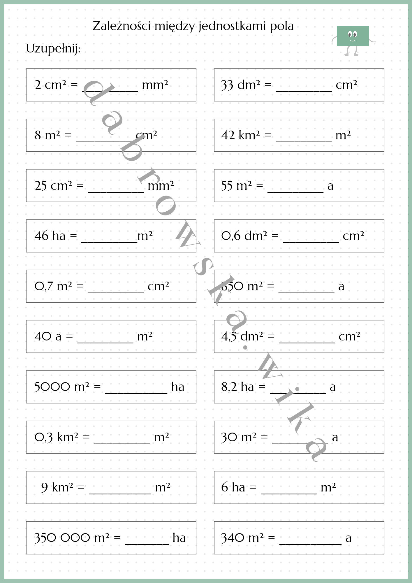 Materiał zawiera kartę pracy z zamiany jednostek pola.