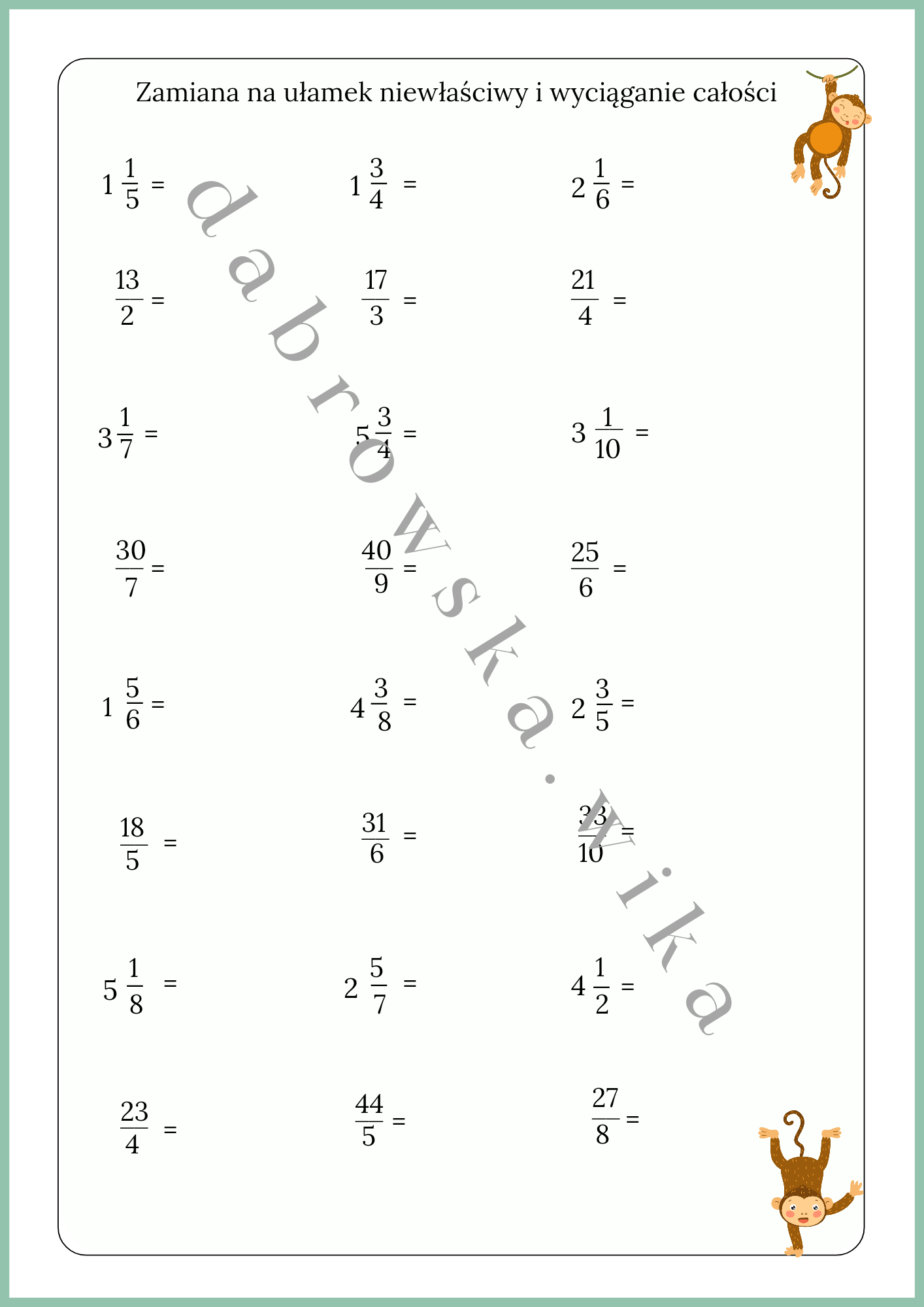 Czeka tutaj aż 12 przykładów z zamiany na ułamek niewłaściwy i 12 przykładów z wyciągania całości.