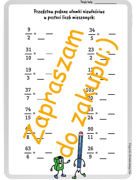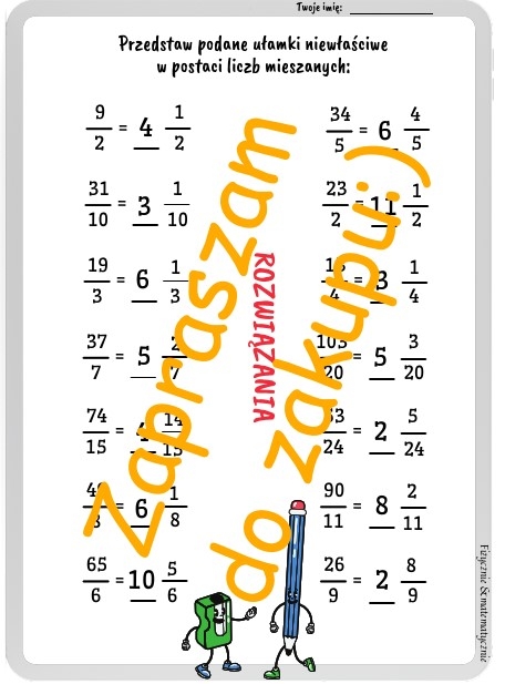Zamiana ułamków niewłaściwych na liczby mieszane - karta pracy lub kartkówka z rozwiązaniem.