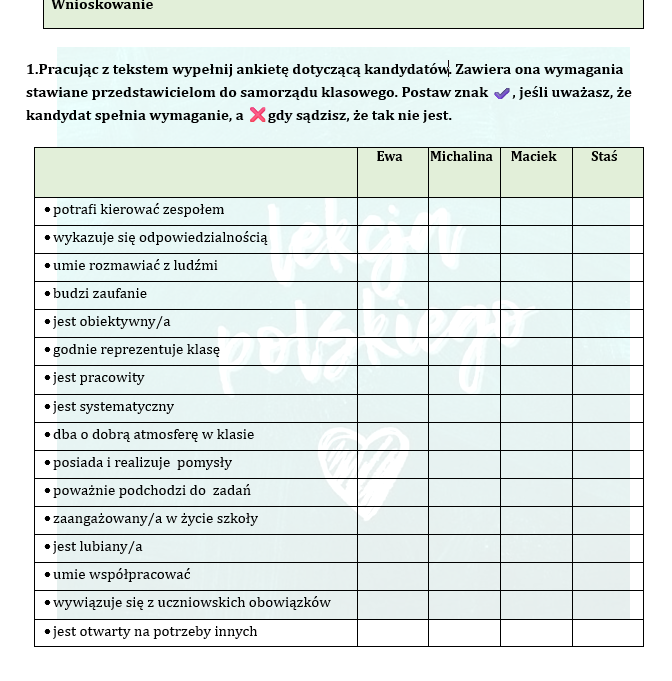 Zanim przygotujesz uczniów klas 7–8 do pisania rozprawki, poćwicz argumentowanie. Ten materiał dydaktyczny to zestaw ćwiczeń oparty na bliskim uczniom kontekście wyborów samorządu klasowego. Zawiera teksty, pytania sprawdzające i rozwijające rozumienie, wnioskowanie i argumentowanie oraz przykładowe odpowiedzi. To narzędzie, które poprowadzi młodzież do samodzielnego redagowania rozprawki.