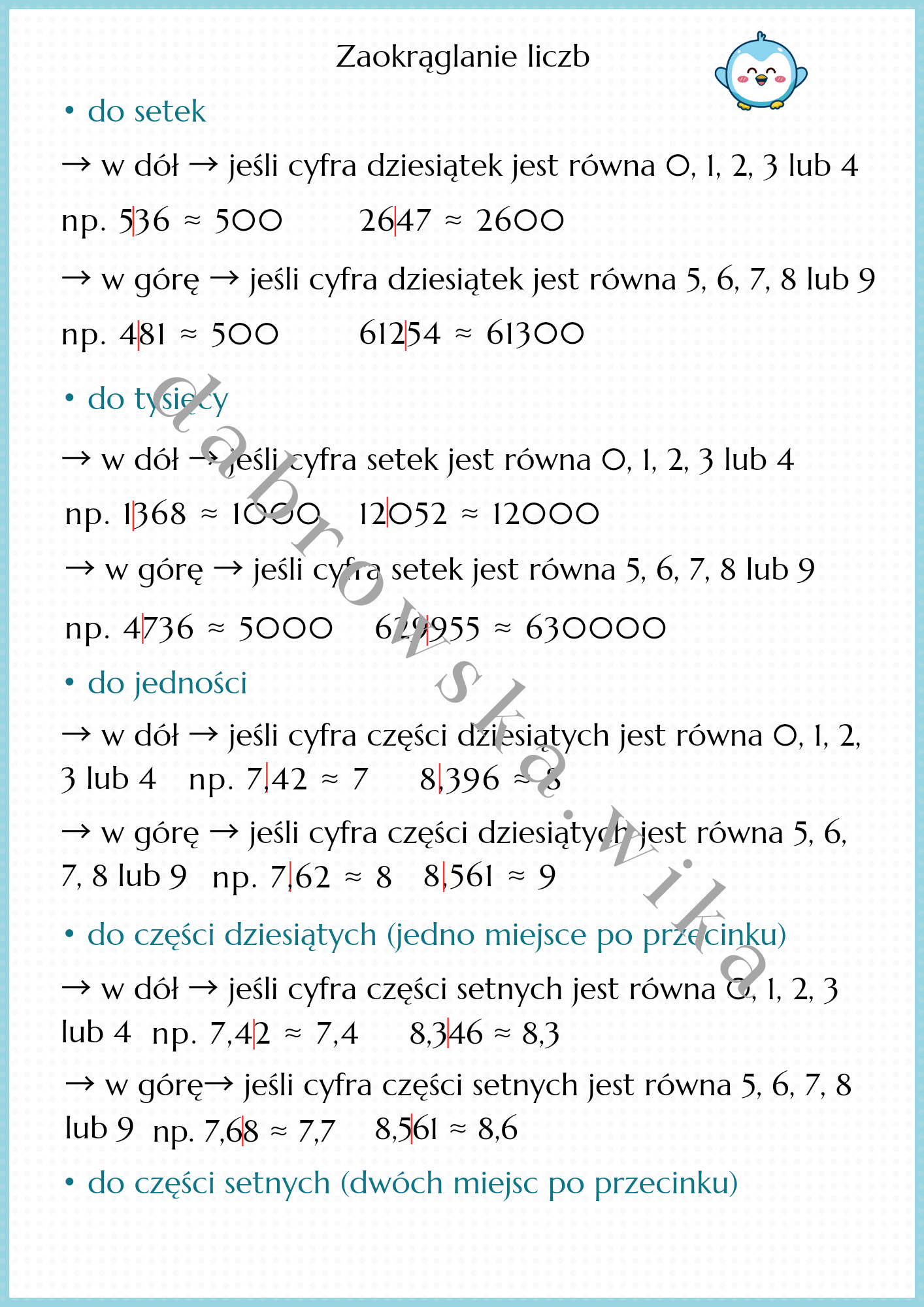 - zaokrąglanie do setek, tysięcy, jedności, części dziesiątych, części setnych.