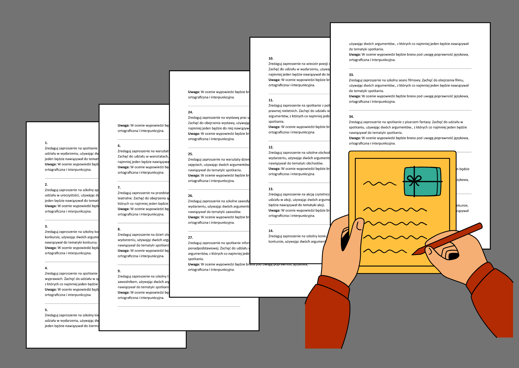 Ten zestaw zawiera 40 różnorodnych poleceń egzaminacyjnych dotyczących redagowania zaproszenia – opracowanych w formule zgodnej z wymaganiami CKE.