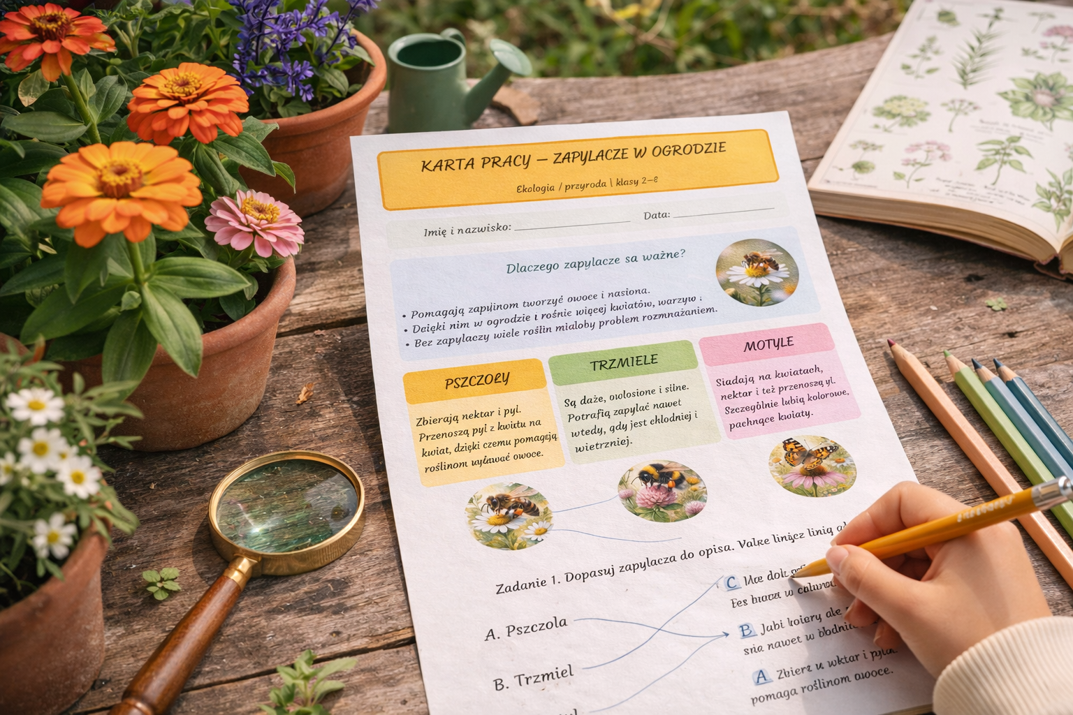 „Zapylacze w ogrodzie” to coś więcej niż zwykłe ćwiczenia – to mała, pięknie opracowana lekcja szacunku do natury. Dzieci poznają świat owadów zapylających, dowiadują się, jaką rolę pełnią pszczoły, trzmiele i motyle, a przy okazji uczą się, jak same mogą pomagać przyrodzie 🐝🦋🌼