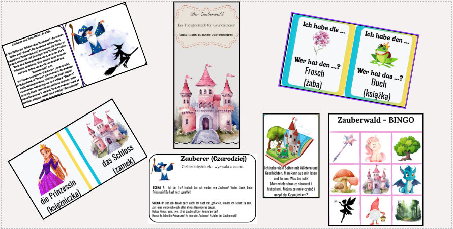 Od słowa do sztuki teatralnej w waszej szkole. Początkowo na zajęciach wprowadzamy karty obrazkowe, gramy w bingo - 2 wersje, wykorzystujemy grę: Ja mam... - Kto ma ...? Przechodzimy do trudniejszych zadań - krzyżówki, zagadki, wykreślanki, robiąc przerywniki gimnastyczne - karty zabaw ruchowych. W następnym kroku zapoznajemy uczniów z tekstem bajki: Zauberwald. W grupach lub indywidualnie tworzymy książeczkę - uczniowie wykonują ilustracje do fragmentów bajki. Robimy wystawę prac uczniów. Kolejnym krokiem będzie przygotowanie występów: scenariusz wraz z przydzielonymi dla każdego aktora tekstami z każdej sceny w formie karty, potrzebnymi rekwizytami do każdej sceny jest super ułatwieniem pracy z tekstem i wesprze każdego, kto jest zainteresowany tym przedstawieniem. Jeżeli uczniowie nie mają ochoty na przedstawienie przed publicznością, mogą wykonać pacynki, maski postaci ze sztuki i zrobić teatrzyk kukiełkowy.