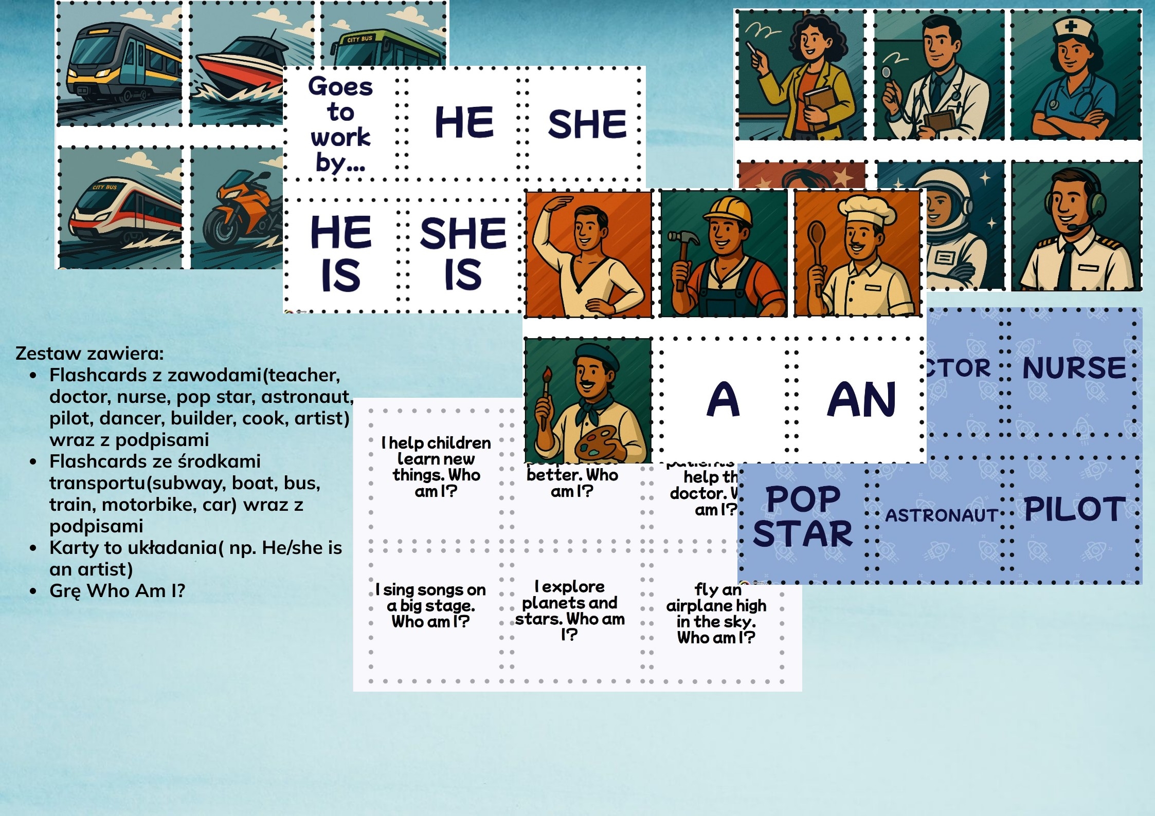• Flashcards z zawodami(teacher, doctor, nurse, pop star, astronaut, pilot, dancer, builder, cook, artist) wraz z podpisami