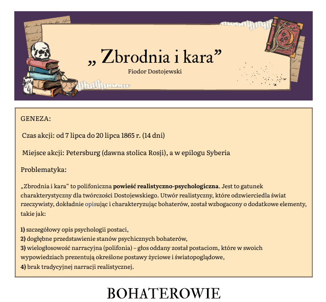 Jestem studentką filologii polskiej i od kilku lat aktywnie prowadzę korepetycje z języka polskiego dla uczniów od klasy 4 szkoły podstawowej do klasy 4 liceum. Wspieram swoich uczniów w dążeniu do jak najlepszych wyników na sprawdzianach, egzaminie ósmoklasisty oraz maturze, a także na każdym etapie ich edukacji. Pracuję na materiałach, które tworzę samodzielnie – są one dostosowane do potrzeb uczniów, przejrzyste i zrozumiałe. Moi uczniowie chętnie z nich korzystają i są z nich bardzo zadowoleni, dlatego postanowiłam podzielić się nimi również z innymi nauczycielami i uczniami oraz tworzyć kolejne. Najczęściej są to opracowania lektur, które pomagają lepiej zrozumieć tekst, uporządkować wiedzę i skutecznie przygotować się do sprawdzianów oraz egzaminów.