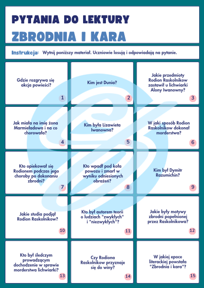 Szukasz skutecznej pomocy dydaktycznej do pracy ze "Zbrodnią i Karą" Fiodora Dostojewskiego? Nasz zestaw 15 pytań i odpowiedzi do tej obowiązkowej lektury szkolnej to idealne rozwiązanie dla nauczycieli! Pytania przygotowane w formie kart, które można losować, sprawiają, że lekcje są interaktywne i angażujące dla uczniów. Dzięki temu metoda pracy staje się bardziej przyjazna i ciekawa, a uczniowie z większym entuzjazmem podchodzą do omawiania treści. Doskonała pomoc edukacyjna, która ułatwia przygotowanie do sprawdzianów i egzaminów z języka polskiego.