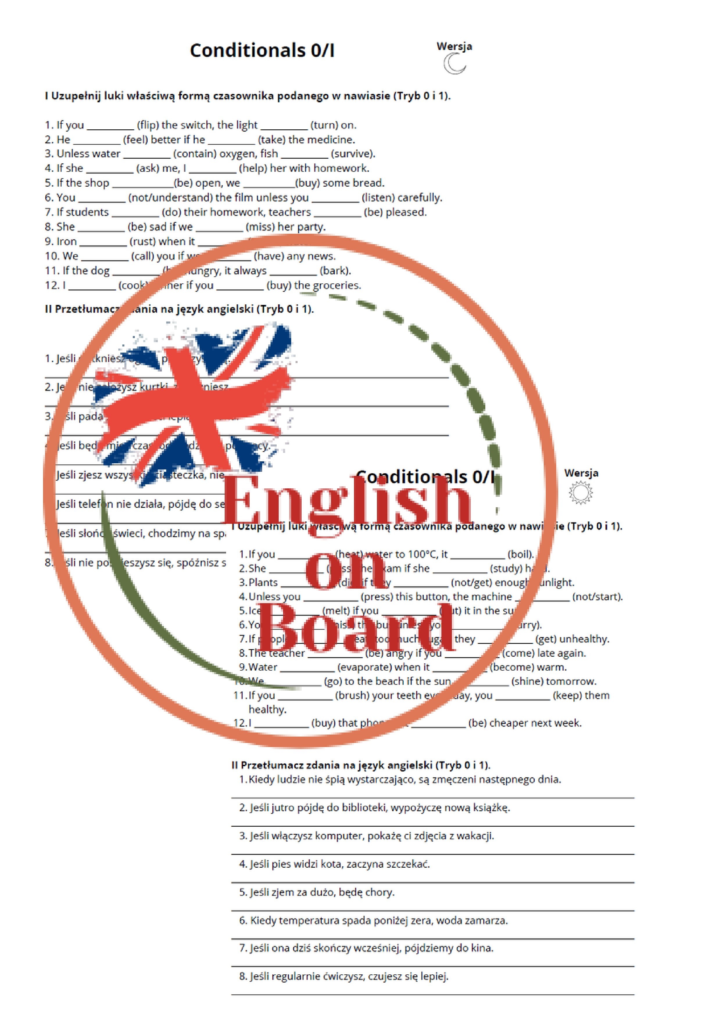 Dwie wersje zadań sprawdzających znajomość zdań warunkowych typu pierwszego i zerowego. Każda karta pracy zawiera dwa zadania: jedno polega na wstawieniu poprawnej formy czasownika do zdania (12 zdań), drugie zadanie polega na przetłumaczeniu 8 zdań na j. angielski. Zestaw posiada klucz z odpowiedziami.