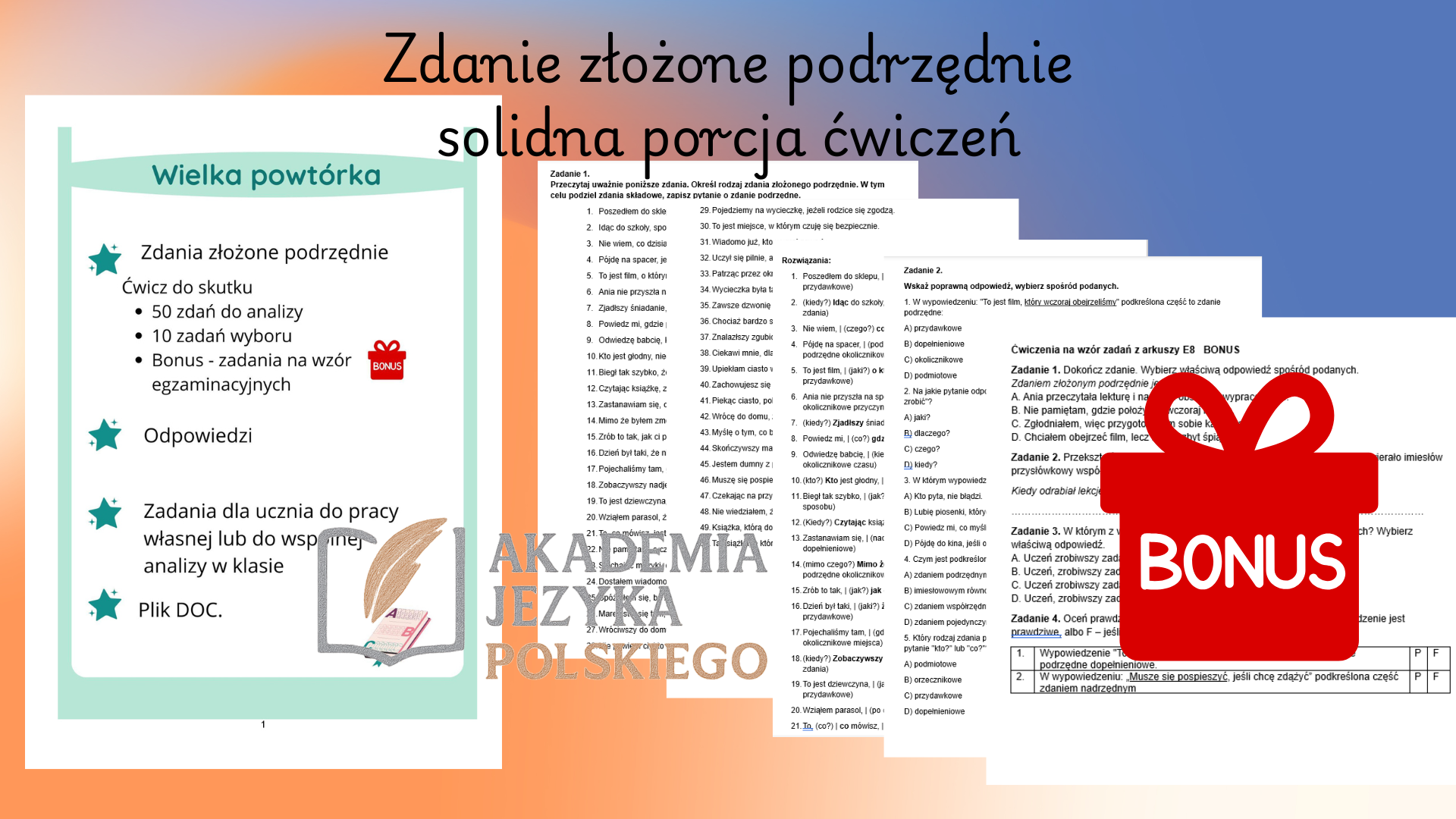 Jako nauczycielka polskiego doskonale wiem, ile wysiłku kosztuje opanowanie rozpoznawania zdań złożonych podrzędnie. Ile przykładów potrzeba, żeby uczniowie w końcu poczuli się pewnie? 5, 10, 15? Moi uczniowie potrzebowali... 50! I właśnie tyle dla nich (i dla Was!) przygotowałam! 💪 Co znajdziesz w zestawie? ✅ 50 starannie przygotowanych zdań złożonych podrzędnie – gwarancja gruntownego utrwalenia schematu i pewności siebie. ✅ Skupienie na kluczowych typach: głównie zdania okolicznikowe, przydawkowe i dopełnieniowe – czyli te, które uczeń musi rozpoznawać. ✅ Imiesłowowy równoważnik zdania . ✅ 10 dodatkowych zadań jednokrotnego wyboru – idealne do szybkiego sprawdzenia wiedzy i utrwalenia. ✅ BONUS: Zadania typu egzaminacyjnego! ✅ Pełne odpowiedzi do wszystkich zadań – oszczędność Twojego czasu i pewność poprawnej nauki.