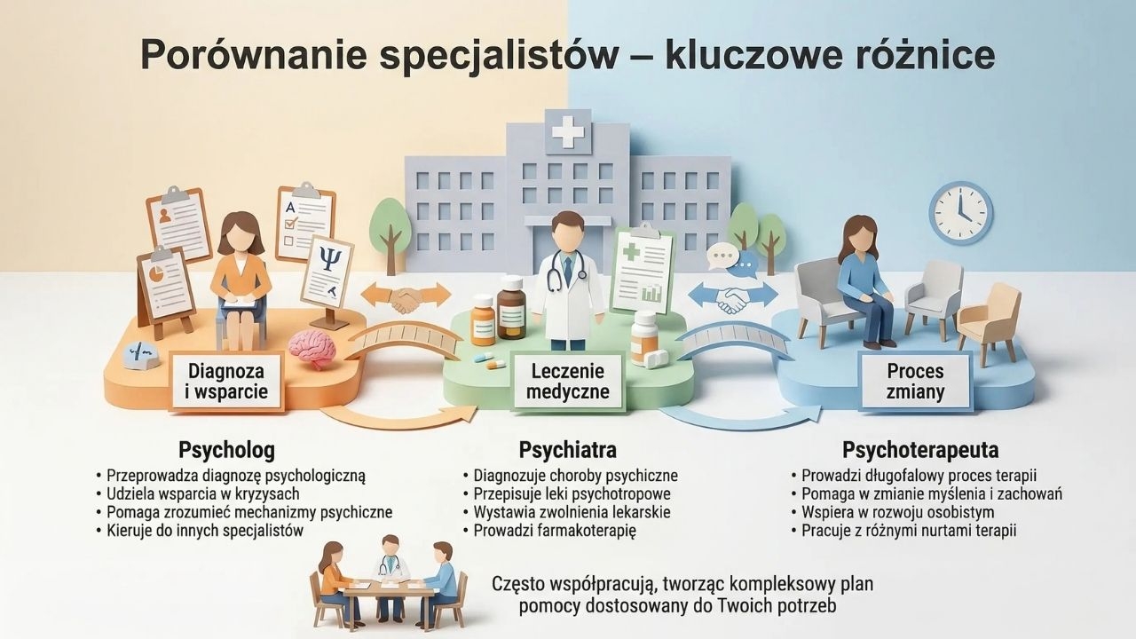 To bardzo potrzebny, przejrzysty materiał edukacyjny w formie gazetki szkolnej lub prezentacji PDF, który pomaga zrozumieć różnice między psychologiem, psychiatrą i psychoterapeutą oraz oswaja temat korzystania ze wsparcia psychicznego. Zestaw zawiera 1 plik PDF i 20 stron, czyli 20 gotowych plansz do wydruku lub wyświetlenia. Materiał rozpoczyna się okładką wprowadzającą do tematu (slajd 1), a następnie pokazuje, dlaczego dbanie o psychikę jest ważne i że szukanie pomocy nie jest oznaką słabości (slajd 2). Kolejny slajd porządkuje trzy ścieżki wsparcia: psycholog, psychiatra i psychoterapeuta (slajd 3). W dalszej części materiał omawia psychologa jako specjalistę od mechanizmów zachowania i emocji (slajd 4), pokazuje jego rolę w diagnozie i wsparciu oraz podkreśla, że psycholog nie przepisuje leków ani nie wystawia zwolnień (slajd 5), a następnie wyjaśnia, kiedy warto udać się do psychologa (slajd 6). Kolejne plansze dotyczą psychiatry: wyjaśniają, że to lekarz zdrowia psychicznego (slajd 7), pokazują jego uprawnienia medyczne – diagnozę, farmakoterapię, skierowania i zwolnienia (slajd 8) oraz opisują sytuacje wymagające wizyty u psychiatry, takie jak ciężka depresja, myśli samobójcze, urojenia czy napady paniki (slajd 9). Następna część skupia się na psychoterapeucie i wyjaśnia jego przygotowanie zawodowe oraz znaczenie własnej terapii i szkolenia podyplomowego (slajd 10). Dalej materiał pokazuje, na czym polega proces psychoterapii i że jest to regularna, długofalowa praca nad zmianą myśli, emocji i zachowań (slajd 11), a następnie porównuje główne nurty terapeutyczne: poznawczo-behawioralny i psychodynamiczny (slajd 12) oraz humanistyczny i systemowy (slajd 13). Kolejny slajd omawia wskazania do podjęcia psychoterapii, takie jak lęk, trauma, problemy psychosomatyczne, trudne emocje czy zaburzenia osobowości (slajd 14). Następnie materiał zestawia wszystkich trzech specjalistów i pokazuje kluczowe różnice w ich kompetencjach oraz to, że często współpracują ze sobą dla dobra pacjenta (slajd 15). Kolejny slajd podkreśla, że mimo różnych metod pracy ich wspólnym celem jest zdrowie i równowaga pacjenta (slajd 16). Ostatnia część oswaja temat zdrowia psychicznego społecznie: przełamuje tabu i pokazuje, że proszenie o pomoc wymaga odwagi (slajd 17), wskazuje konkretne miejsca wsparcia w szkole i poza nią, z zaznaczeniem, że dzieci i młodzież do 18. roku życia nie potrzebują skierowania do psychologa, psychiatry ani psychoterapeuty (slajd 18), podaje numer telefonu zaufania 116 111 jako anonimową i szybką pomoc (slajd 19), a całość zamyka wspierające podsumowanie, że nikt nie musi zostawać sam ze swoimi problemami (slajd 20).