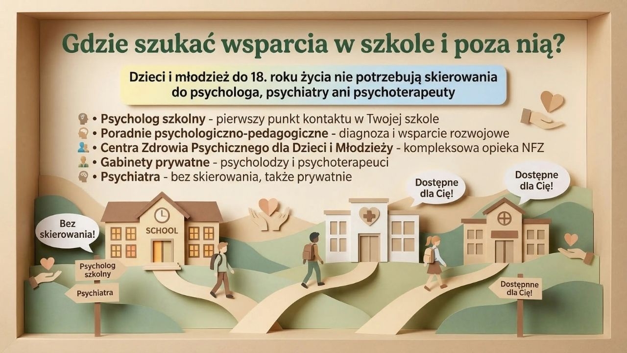 Materiał jest przeznaczony dla starszych klas szkoły podstawowej, szkół ponadpodstawowych, wychowawców, pedagogów, psychologów szkolnych, bibliotek i świetlic. Świetnie sprawdzi się jako gazetka szkolna, prezentacja na godzinę wychowawczą, materiał profilaktyczny, wsparcie podczas zajęć o zdrowiu psychicznym oraz pomoc w rozmowach z młodzieżą o tym, gdzie i kiedy szukać specjalistycznego wsparcia.