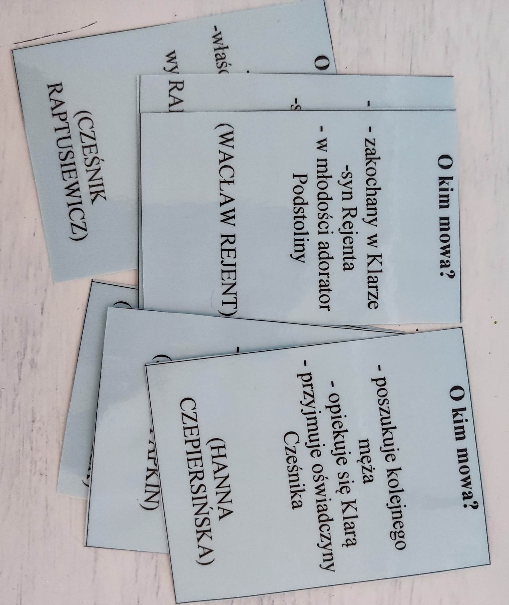 Gra "Zemsta" składa się z 6 kart. Grę można wykorzystać na wiele sposobów: może to być powtórka przed egzaminem, usystematyzowanie wiedzy po omówieniu lektury czy też gra zespołowa. Świetnie się sprawdzi na zastępstwach. Uczniowie bardzo lubią tego typu powtórki. Na każdej karcie znajduje się odpowiedź.