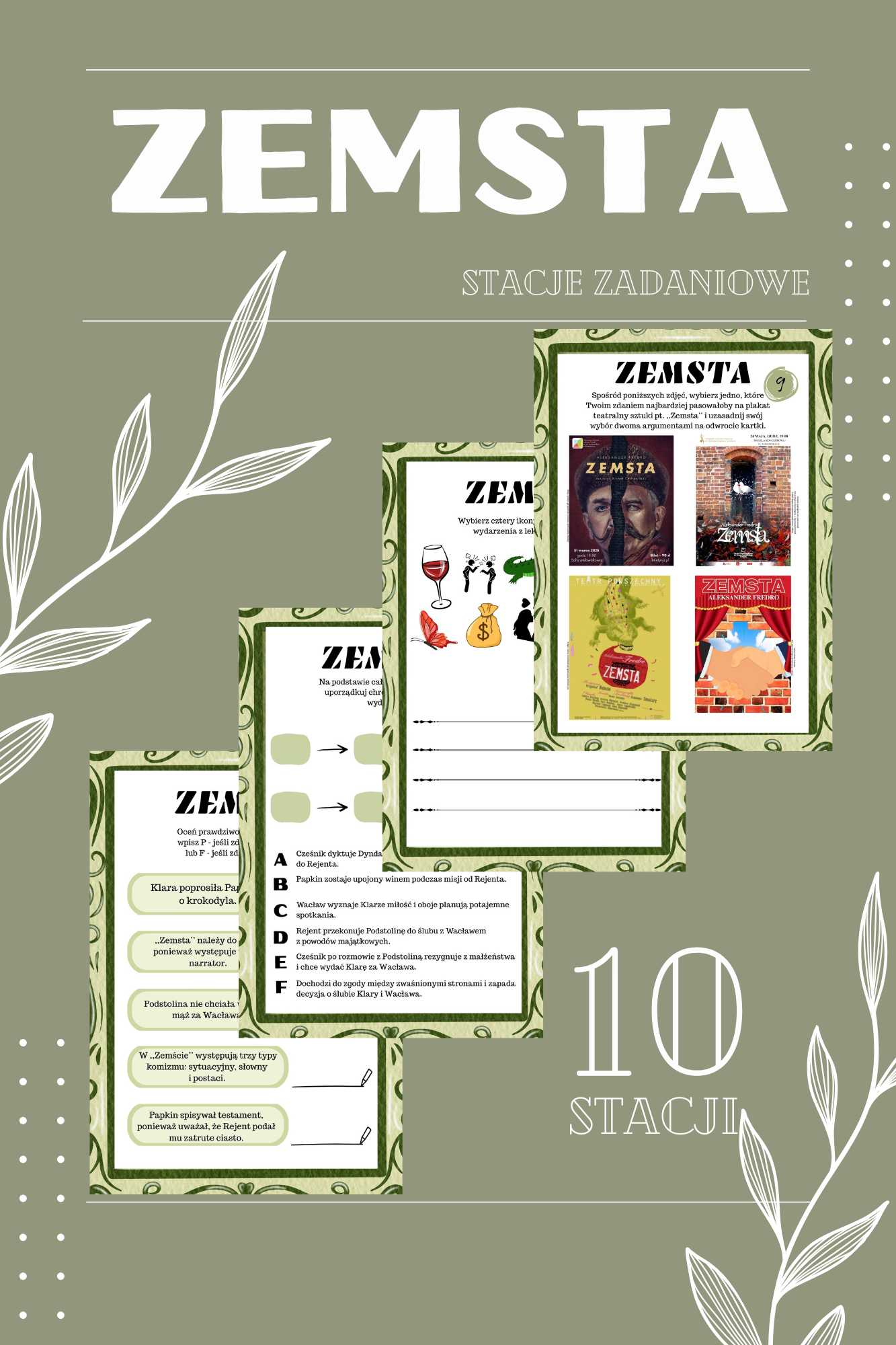 Zestaw zawiera dziesięć kart z różnymi stacjami zadaniowymi z lektury „Zemsta”.