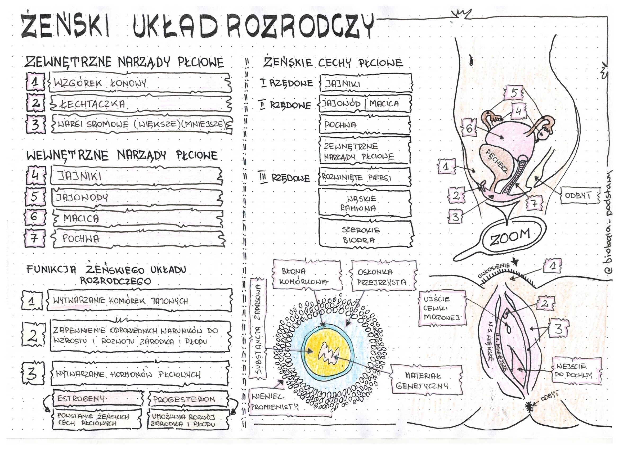Żeński układ rozrodczy– klasa 7 – sketchnotka jako gotowa notatka z lekcji w wersji kolorowej