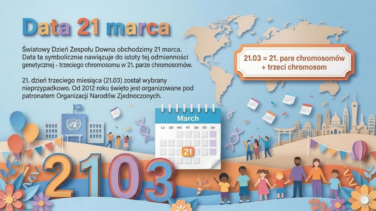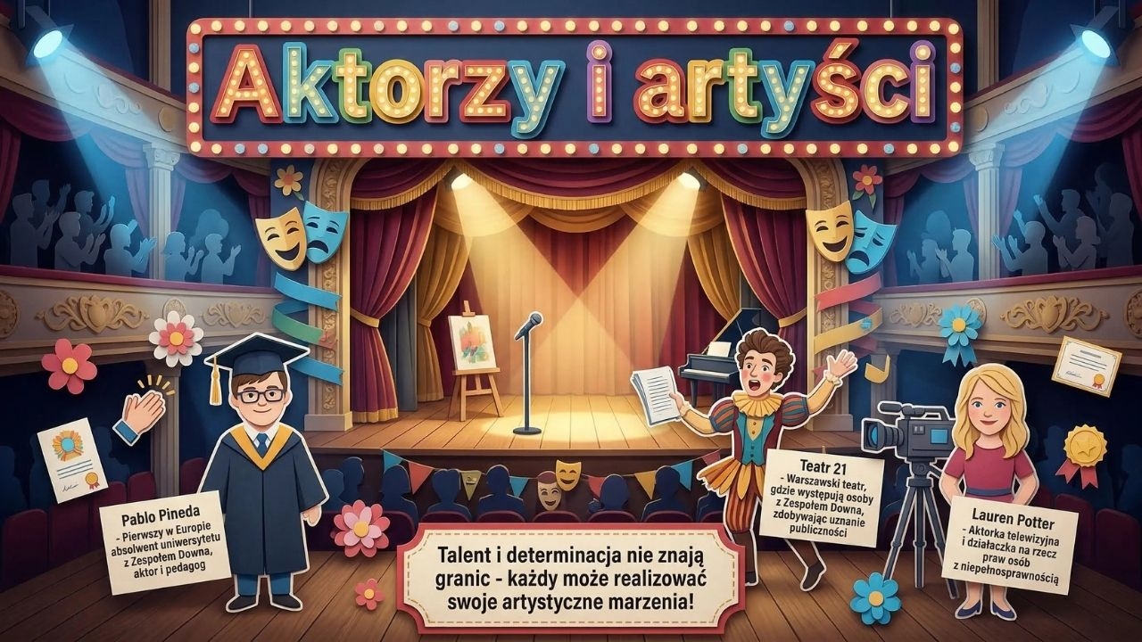 o ciepły, estetyczny materiał edukacyjny w formie gazetki szkolnej lub prezentacji PDF, który w prosty i wspierający sposób przybliża temat Zespołu Downa oraz uczy akceptacji i otwartości wobec różnorodności. Zestaw zawiera 1 plik PDF i 17 stron, czyli 17 gotowych plansz do wydruku lub wyświetlenia. Materiał rozpoczyna się okładką „Zespół Downa” (slajd 1), a następnie wyjaśnia, czym jest Zespół Downa i podkreśla, że nie jest chorobą, lecz odmiennością biologiczną wynikającą z cechy genetycznej (slajd 2). Kolejna plansza tłumaczy trisomię 21, czyli obecność dodatkowego chromosomu w 21. parze (slajd 3), a następna pokazuje, skąd bierze się ta zmiana genetyczna i zaznacza, że nie jest ona „winą” rodziców ani chorobą dziedziczną w prostym rozumieniu (slajd 4). Dalej materiał przybliża postać lekarza Johna Langdona Downa, który jako pierwszy opisał cechy tego zespołu (slajd 5). W środkowej części pojawia się blok „mity i fakty”, który pomaga obalać stereotypy. Plansze pokazują, że stopień niepełnosprawności jest bardzo zróżnicowany i wiele osób z Zespołem Downa dobrze funkcjonuje społecznie (slajd 6), że osoby z Zespołem Downa nie wyglądają „tak samo”, bo każda jest inna i wyjątkowa (slajd 7), że przeżywają pełne spektrum emocji i stereotyp „wiecznie szczęśliwego dziecka” jest krzywdzący (slajd 8), a także że mogą się uczyć, rozwijać, zdobywać nowe umiejętności, kończyć szkoły i pracować (slajd 9). Następnie materiał wyjaśnia znaczenie daty 21 marca jako symbolicznego odniesienia do trisomii 21 i światowego dnia świadomości Zespołu Downa (slajd 10) oraz tłumaczy symbol kolorowych skarpetek nie do pary jako znaku różnorodności, akceptacji i solidarności (slajd 11). Końcowe plansze pokazują osoby z Zespołem Downa w realnym życiu: jako aktorów i artystów realizujących swoje marzenia (slajd 12), sportowców i pracowników funkcjonujących zawodowo i społecznie (slajd 13), a także osoby prowadzące codzienne, zwyczajne życie – uczące się, rozwijające pasje, budujące przyjaźnie i relacje (slajd 14). Następna plansza ma wymiar wychowawczy i podpowiada, jak być dobrym kolegą lub koleżanką: rozmawiać bezpośrednio, zapraszać do wspólnej zabawy, być cierpliwym i traktować wszystkich z szacunkiem (slajd 15). Kolejna pokazuje znaczenie edukacji i otwartości jako najlepszej drogi do przełamywania stereotypów i uprzedzeń (slajd 16), a całość zamyka plansza o inkluzyjnym świecie, w którym każdy ma prawo czuć się potrzebny, akceptowany i ważny (slajd 17).