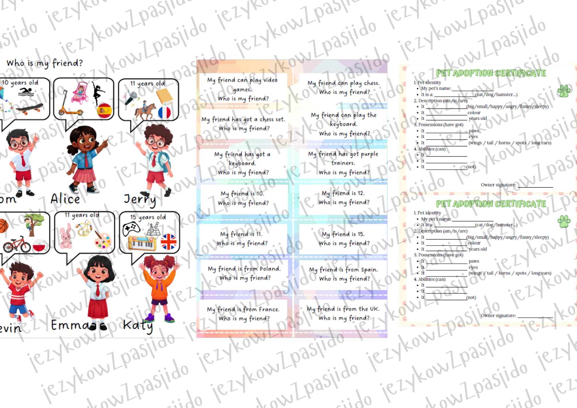 6 postaci do speaking activities- oraz szablon do uzupełnienia o mnie i moim przyjacielu, które łączą wszystkie 3 czasowniki.