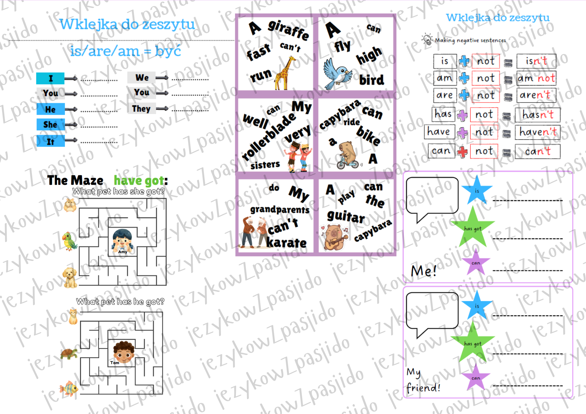 3 wklejki do zeszytu z odmianą czasownika to be/have got oraz zdania przeczące