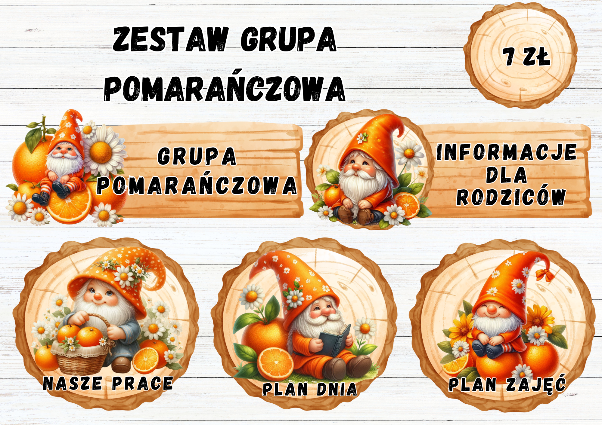 – grafiki: „grupa + nazwa”, „informacje dla rodziców”, „nasze zasady”, „konsultacje”, „tematyka tygodnia”, „tematyka miesiąca”, „nasza grupa”, „nasze prace”, „plan dnia”, „plan zajęć” po jednej na stronę A4,