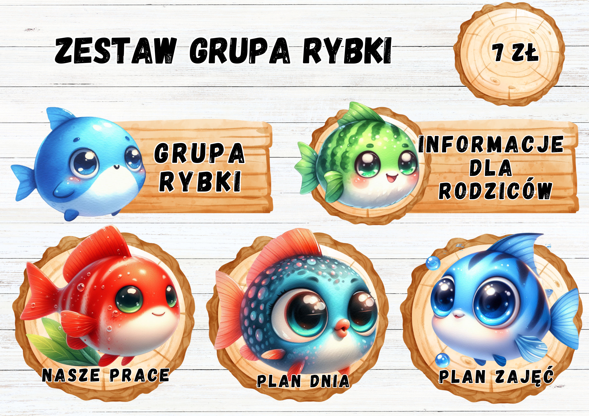 – grafiki: „grupa + nazwa”, „informacje dla rodziców”, „nasze zasady”, „konsultacje”, „tematyka tygodnia”, „tematyka miesiąca”, „nasza grupa”, „nasze prace”, „plan dnia”, „plan zajęć” po jednej na stronę A4,
