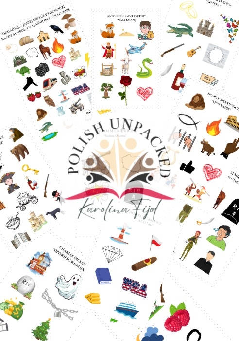 Zestaw zawiera 13 kart, każda karta pracy zawiera ikony do konkretnej lektury: