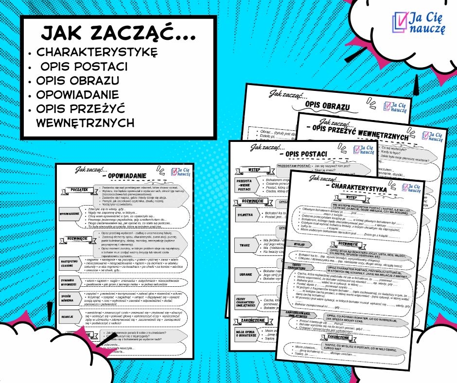 Zestaw zawiera pięć plansz, z których każda jest oddzielną pomocą, ułatwiającą uczniom pisanie opowiadania, charakterystyki, opisu obrazu, postaci i przeżyć wewnętrznych. Gotowe schematy i początki zdań, dzięki którym uczniowie wyrobią sobie umiejętność poprawnegho konstruowania wypoiwiedzi.
