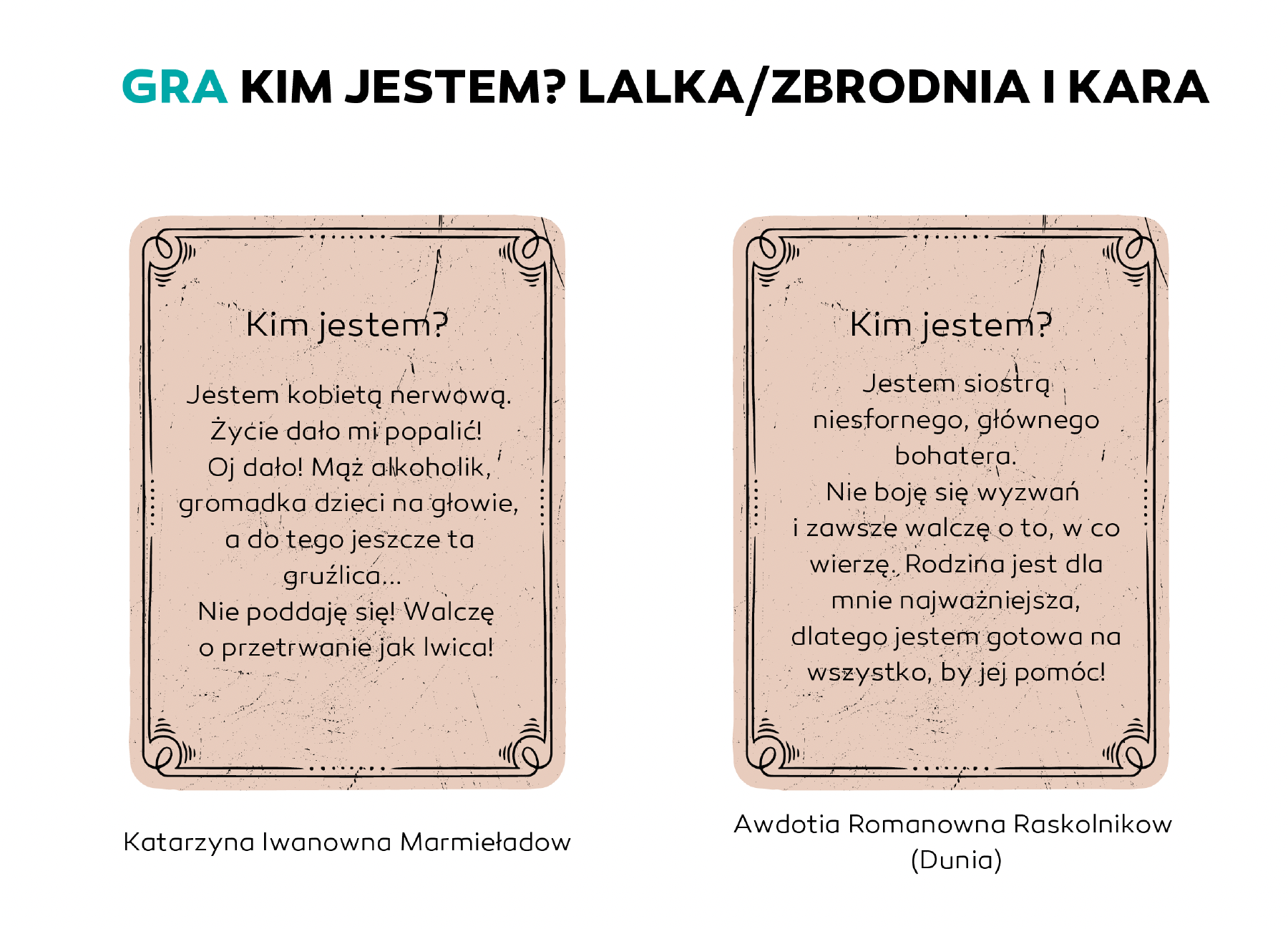 Zestaw 32 kart do gry "Kim jestem?". To innowacyjne narzędzie dydaktyczne, które w angażujący sposób wprowadza uczniów w świat dwóch arcydzieł literatury: "Zbrodni i kary" Fiodora Dostojewskiego oraz "Lalki" Bolesława Prusa.
