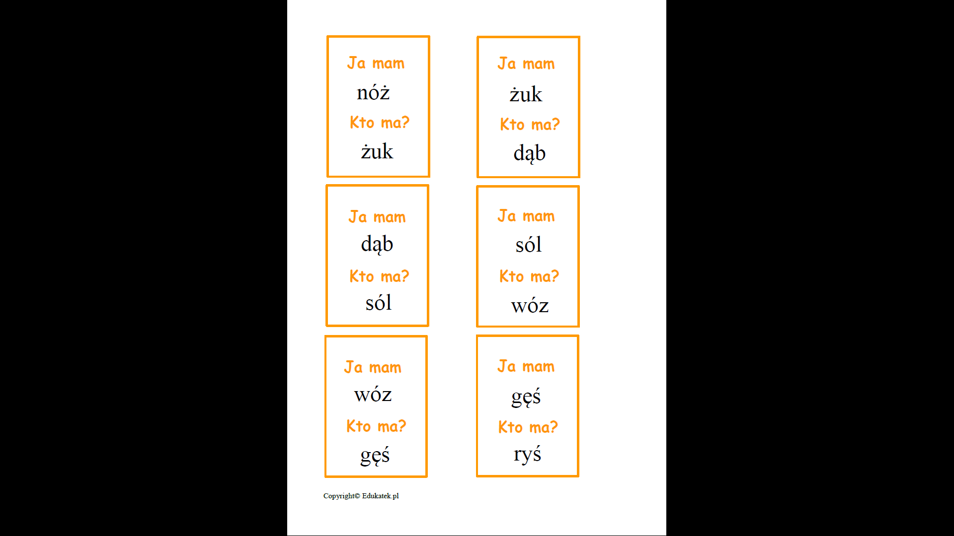 32 karty z wyrazami jednosylabowymi (zestaw trudniejszy, bo zawiera wszystkie polskie znaki- zmiękczenia, ogonki, itp.)